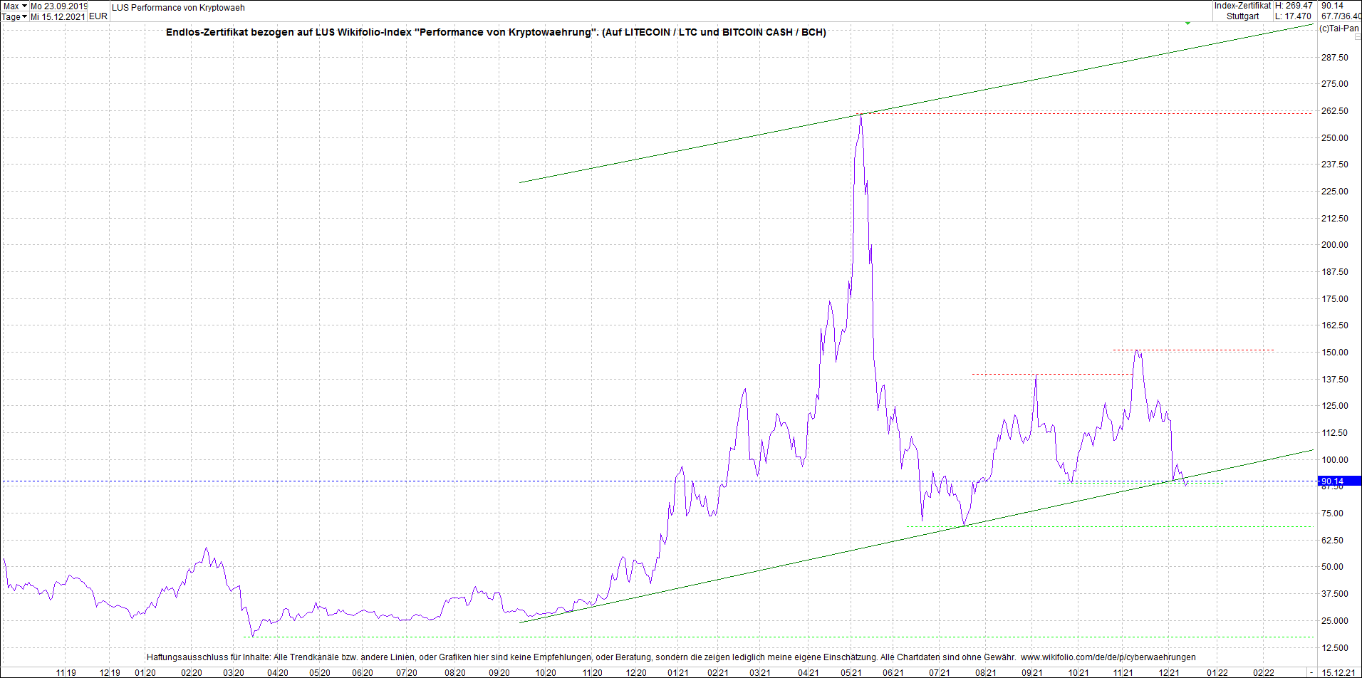 | Anbei das Zertifikat, bekannt als: Endlos-Zertifikat bezogen auf LUS Wikifolio-Index „Performance von Kryptowaehrung“, jetzt versorgt mit Performance von Litecoin (LTC) und mit Bitcoin Cash (BCH). |