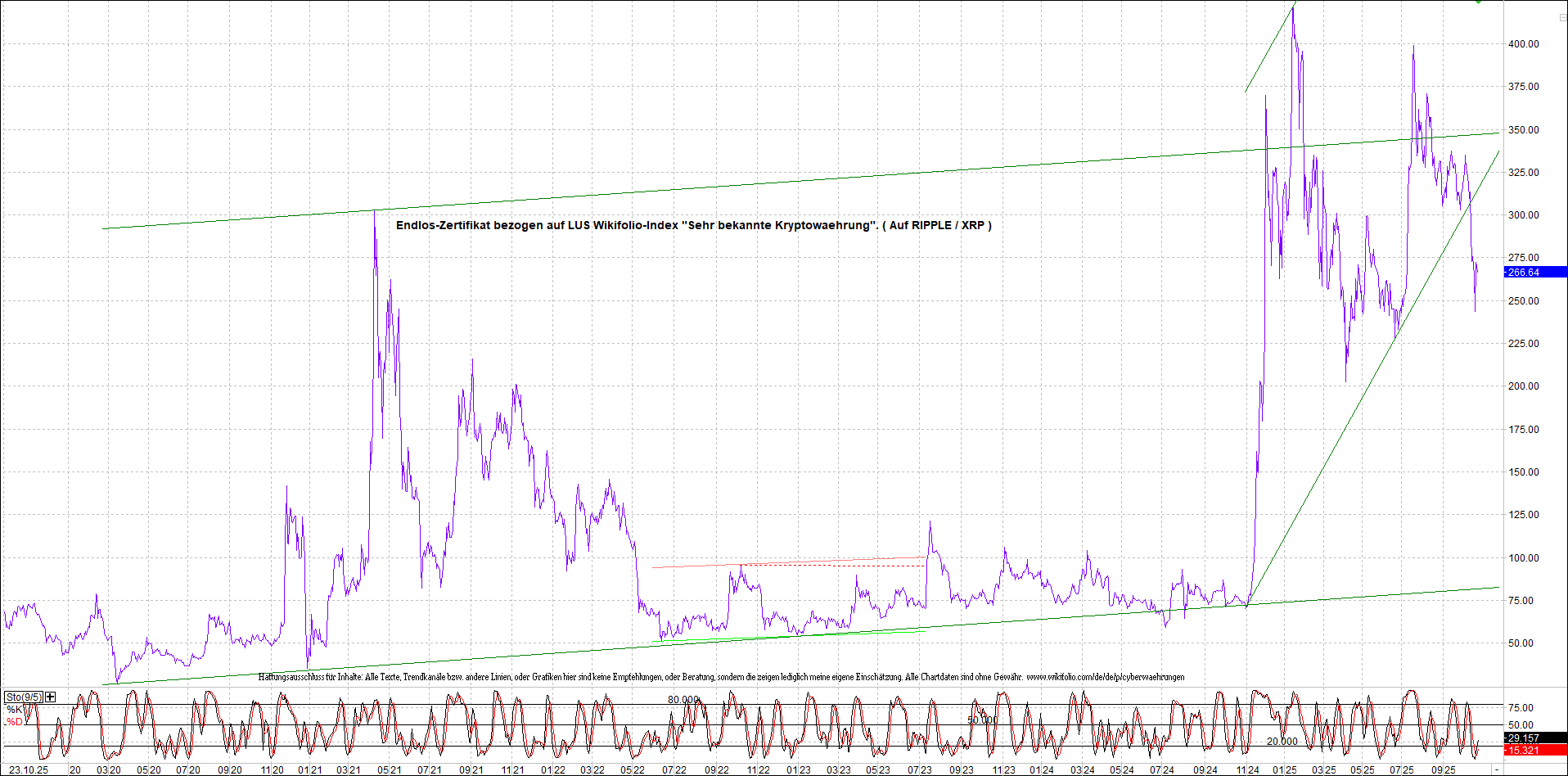 Anbei das dazugehörige Ripplezertifikat, bekannt als: Endlos-Zertifikat bezogen auf LUS Wikifolio-Index „Sehr bekannte Kryptowaehrung“.