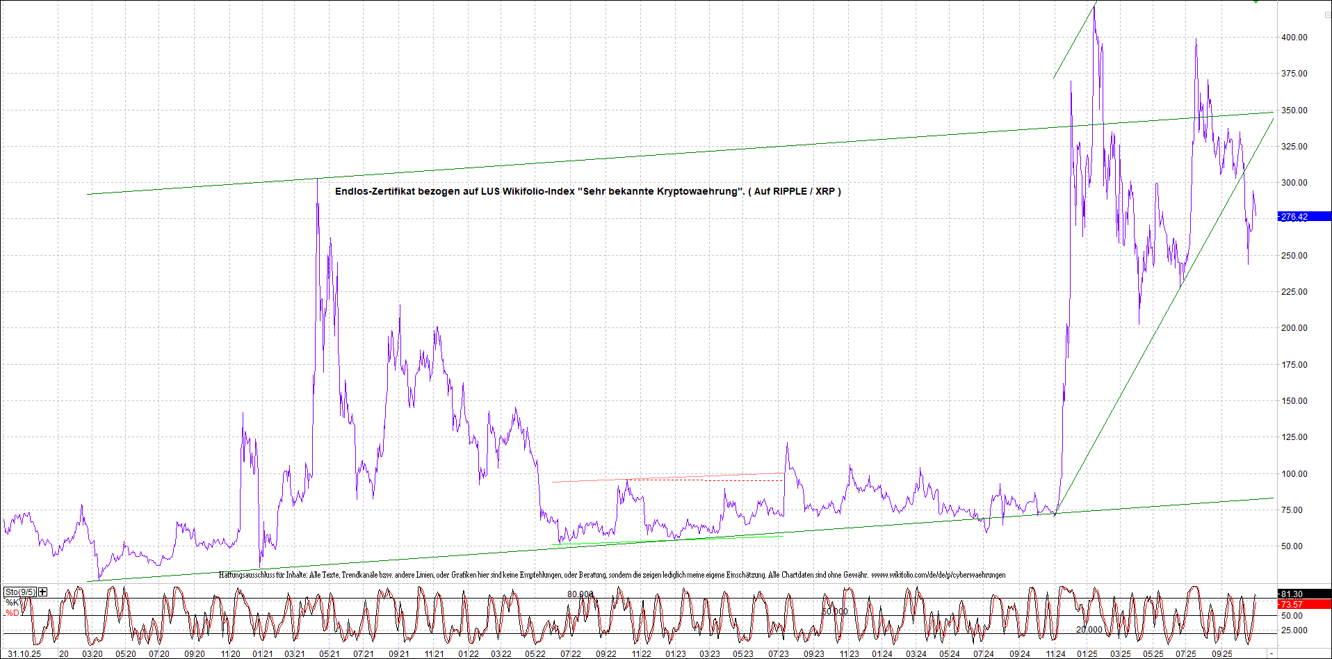 Anbei das dazugehörige Ripplezertifikat, bekannt als: Endlos-Zertifikat bezogen auf LUS Wikifolio-Index „Sehr bekannte Kryptowaehrung“.