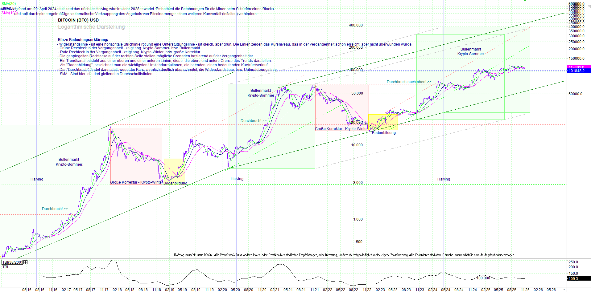 BITCOIN (BTC) – 10 Jahre Chart, von heute Morgen, mit Charttechnik.