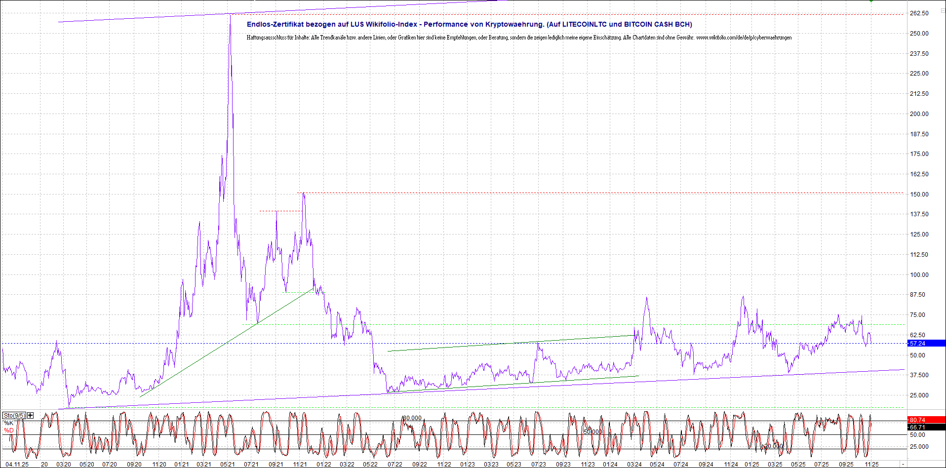 Anbei das Zertifikat, bekannt als: Endlos-Zertifikat bezogen auf LUS Wikifolio-Index „Performance von Kryptowaehrung“, jetzt versorgt mit Performance von Litecoin (LTC) und mit Bitcoin Cash (BCH).