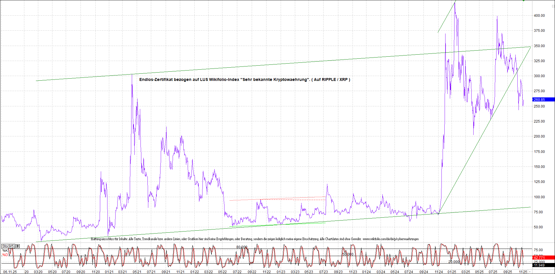 Anbei das dazugehörige Ripplezertifikat, bekannt als: Endlos-Zertifikat bezogen auf LUS Wikifolio-Index „Sehr bekannte Kryptowaehrung“.