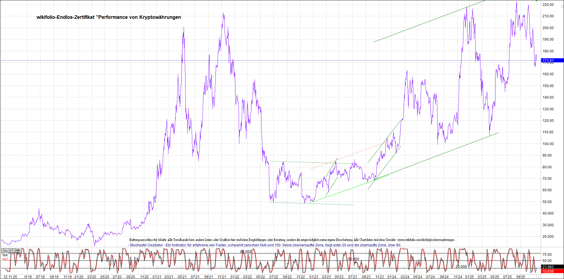 Das Zertifikat, bekannt als: Endlos-Zertifikat bezogen auf LUS Wikifolio-Index „Performance von Kryptowährungen“.