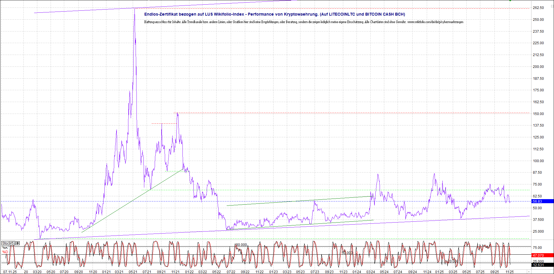 Anbei das Zertifikat, bekannt als: Endlos-Zertifikat bezogen auf LUS Wikifolio-Index „Performance von Kryptowaehrung“, jetzt versorgt mit Performance von Litecoin (LTC) und mit Bitcoin Cash (BCH).