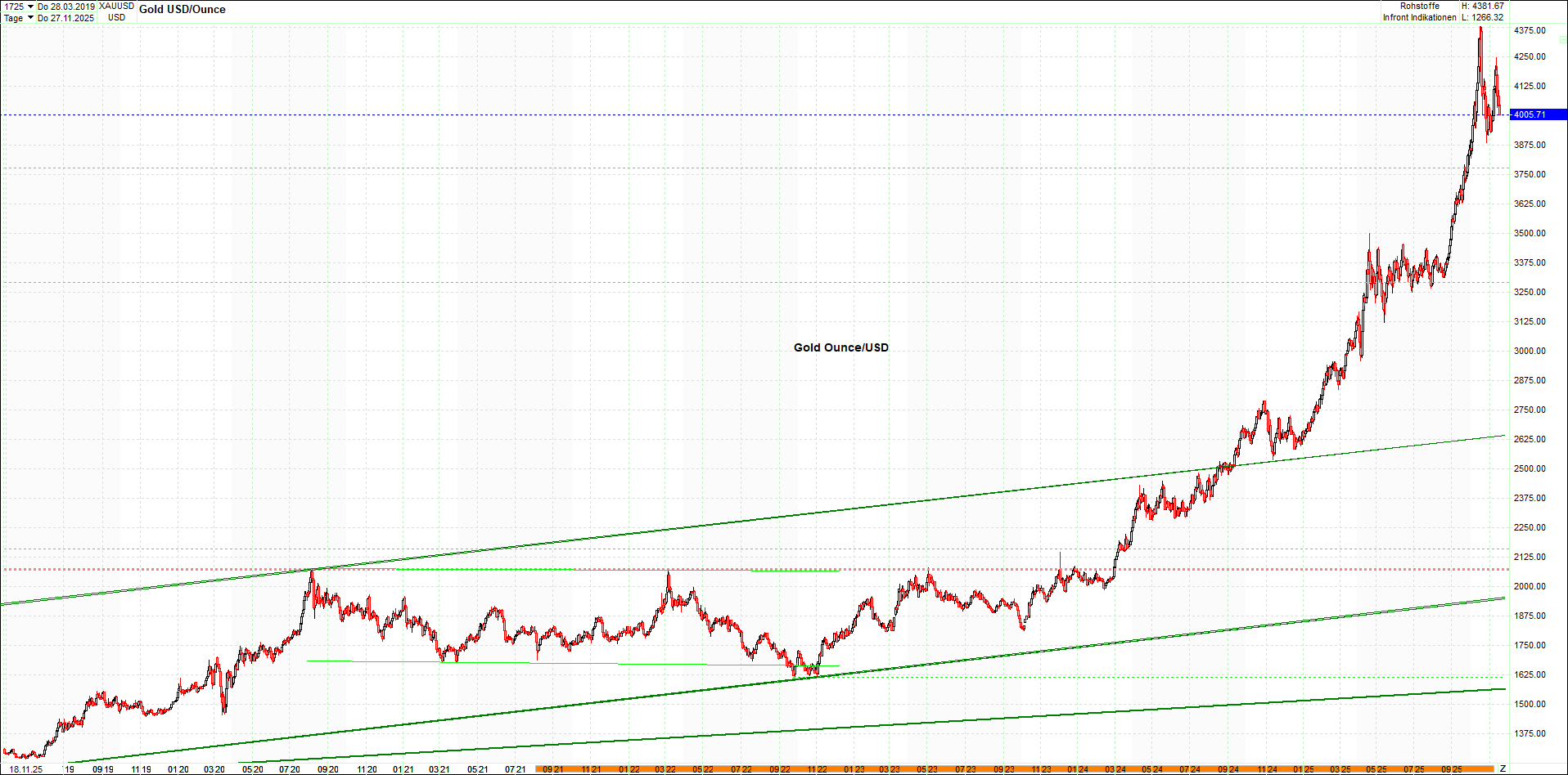 GOLD – 10 Jahre Chart von heute Morgen, mit Charttechnik.