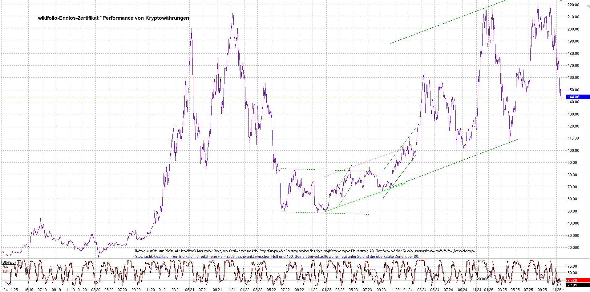 Das Zertifikat, bekannt als: Endlos-Zertifikat bezogen auf LUS Wikifolio-Index „Performance von Kryptowährungen“.