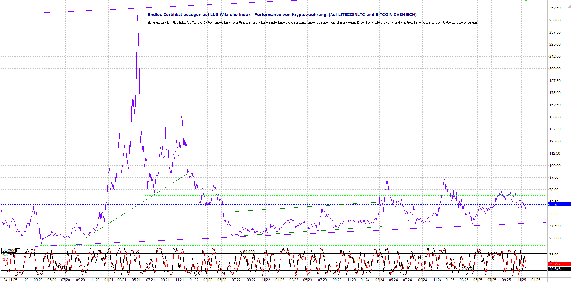 Anbei das Zertifikat, bekannt als: Endlos-Zertifikat bezogen auf LUS Wikifolio-Index „Performance von Kryptowaehrung“, jetzt versorgt mit Performance von Litecoin (LTC) und mit Bitcoin Cash (BCH).