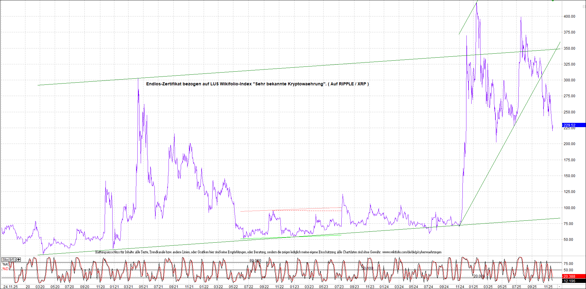 Anbei das dazugehörige Ripplezertifikat, bekannt als: Endlos-Zertifikat bezogen auf LUS Wikifolio-Index „Sehr bekannte Kryptowaehrung“.