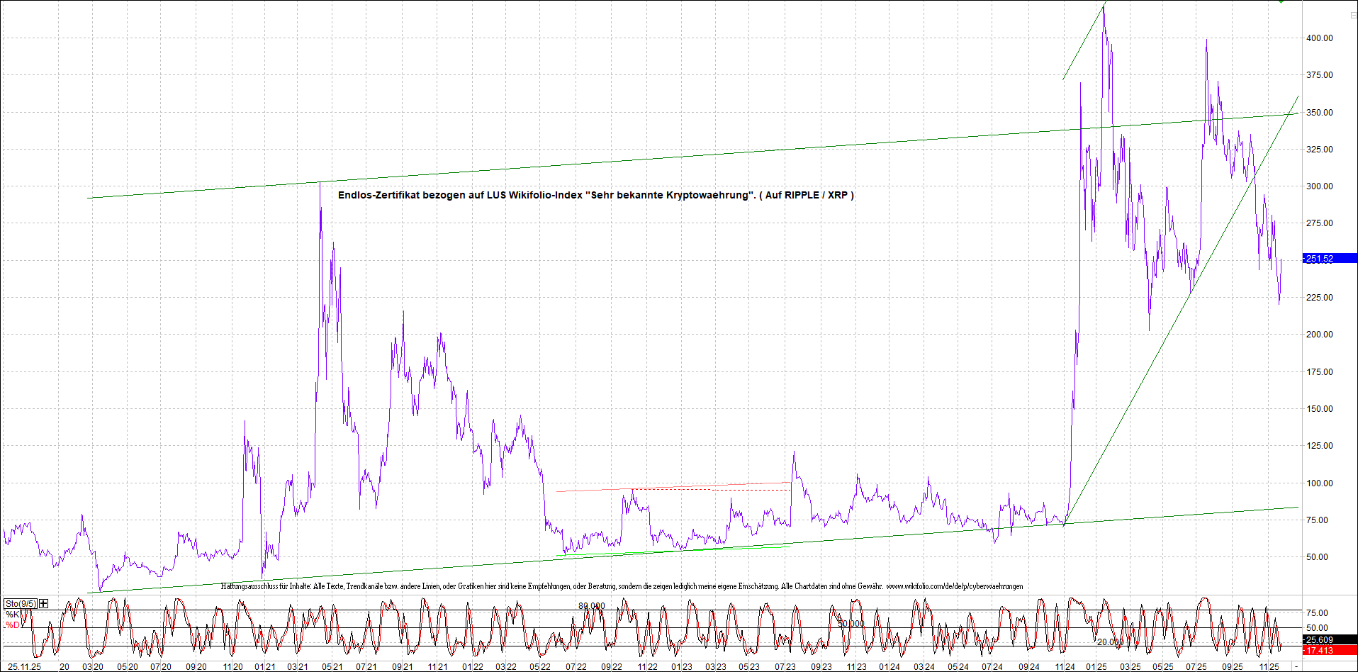 Anbei das dazugehörige Ripplezertifikat, bekannt als: Endlos-Zertifikat bezogen auf LUS Wikifolio-Index „Sehr bekannte Kryptowaehrung“.