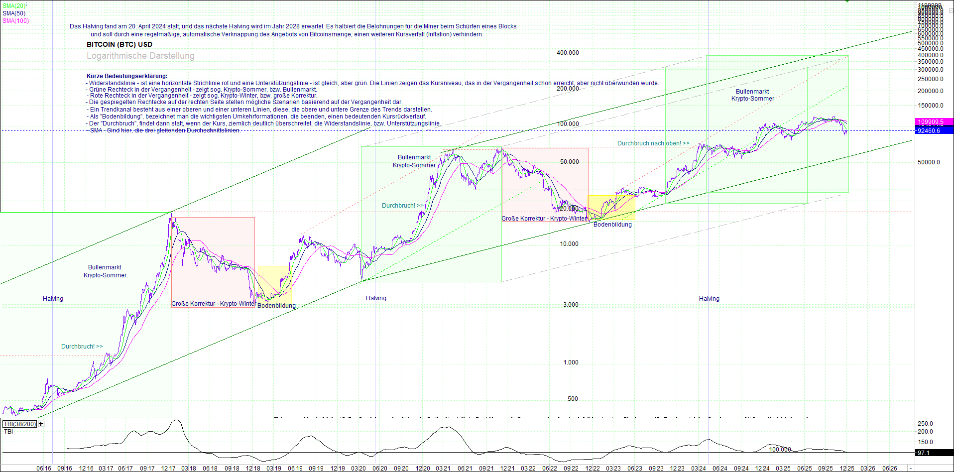 BITCOIN (BTC) – 10 Jahre Chart, von heute Morgen, mit Charttechnik.