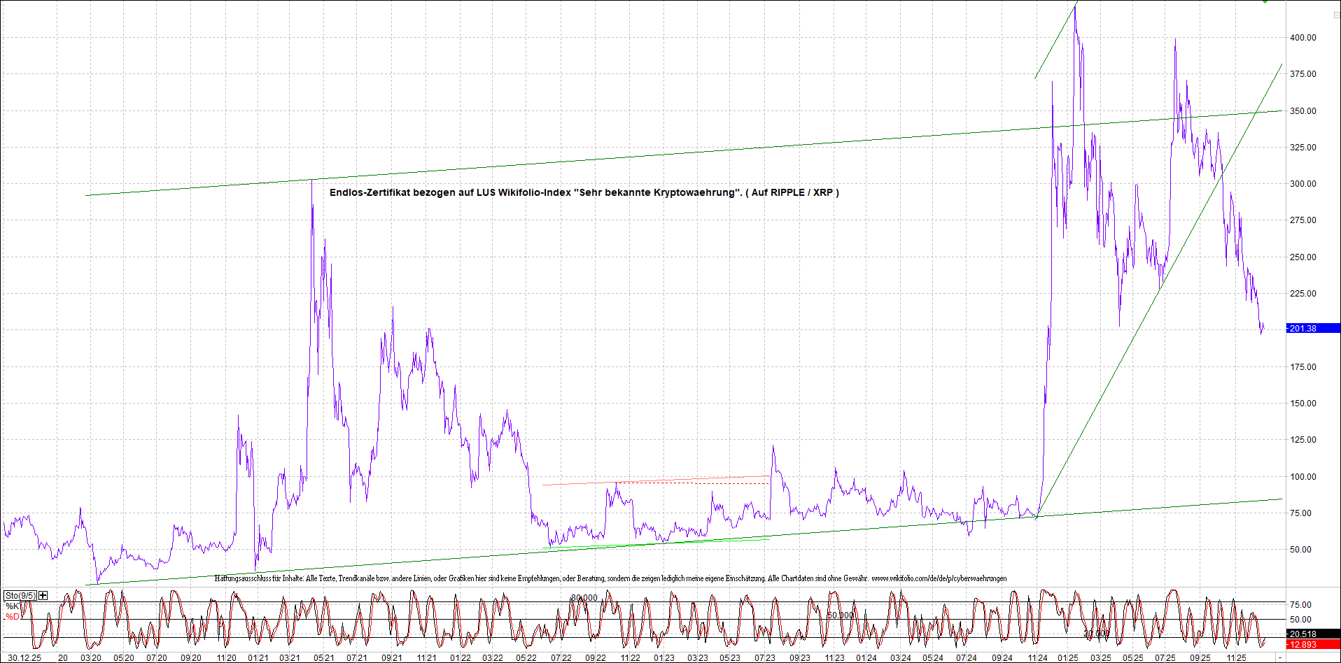 Anbei das dazugehörige Ripplezertifikat, bekannt als: Endlos-Zertifikat bezogen auf LUS Wikifolio-Index „Sehr bekannte Kryptowaehrung“.