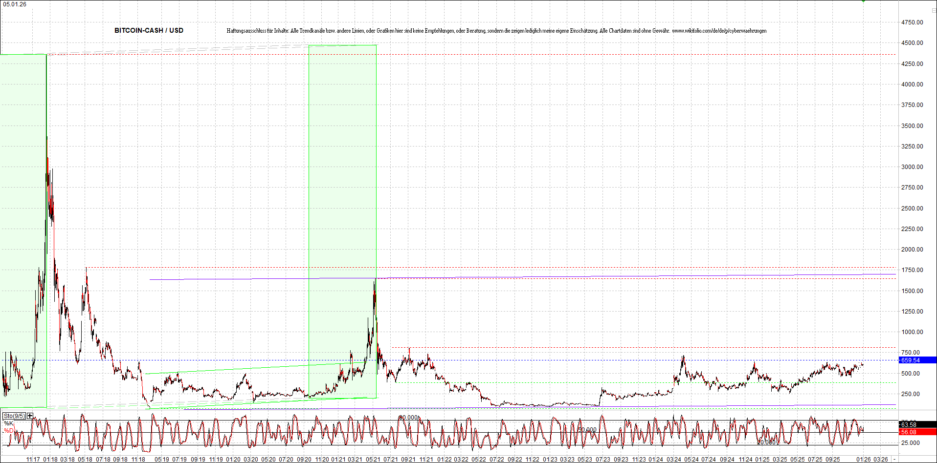 Bitcoin Cash (BCH) – 6 Jahre Chart, von heute Morgen, mit Charttechnik.