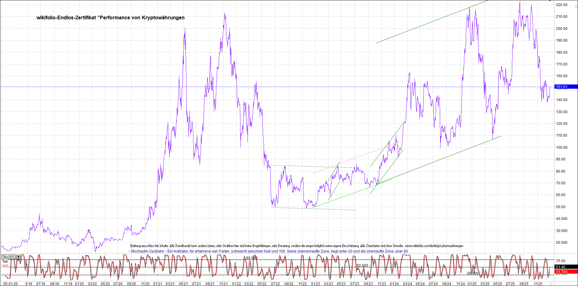 Das Zertifikat, bekannt als: Endlos-Zertifikat bezogen auf LUS Wikifolio-Index „Performance von Kryptowährungen“.