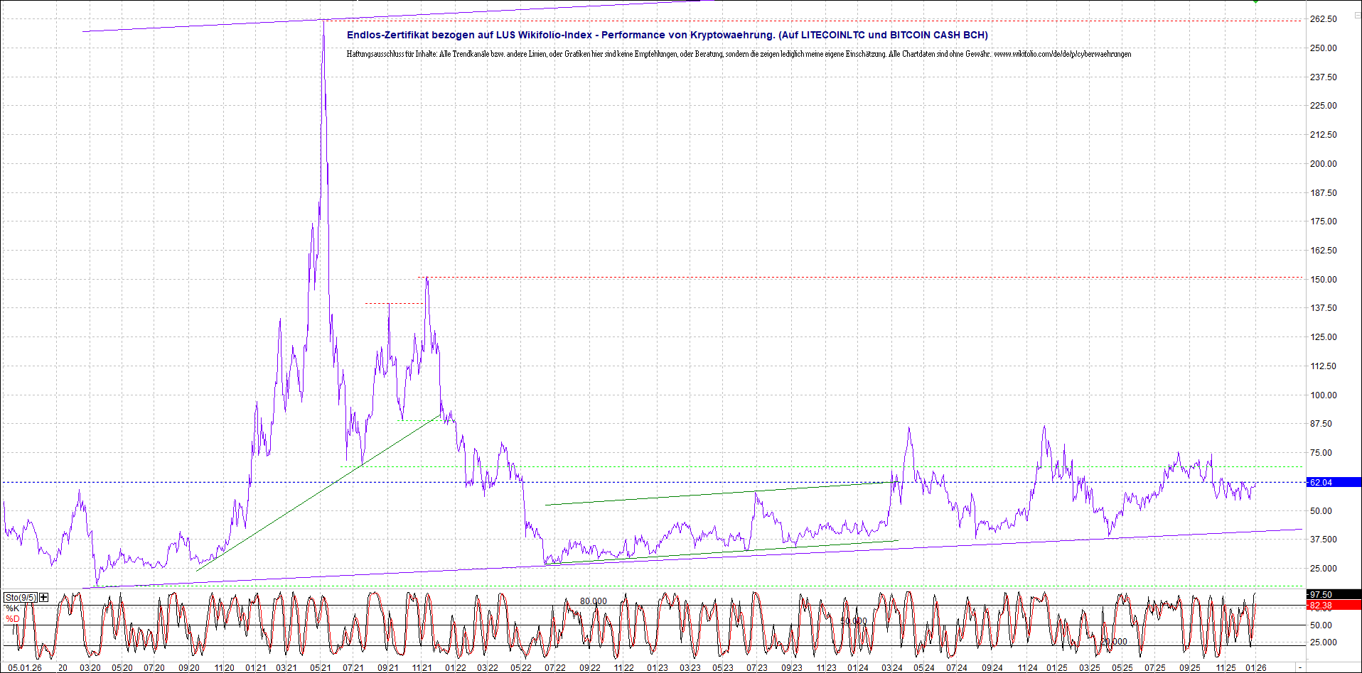 Anbei das Zertifikat, bekannt als: Endlos-Zertifikat bezogen auf LUS Wikifolio-Index „Performance von Kryptowaehrung“, jetzt versorgt mit Performance von Litecoin (LTC) und mit Bitcoin Cash (BCH).