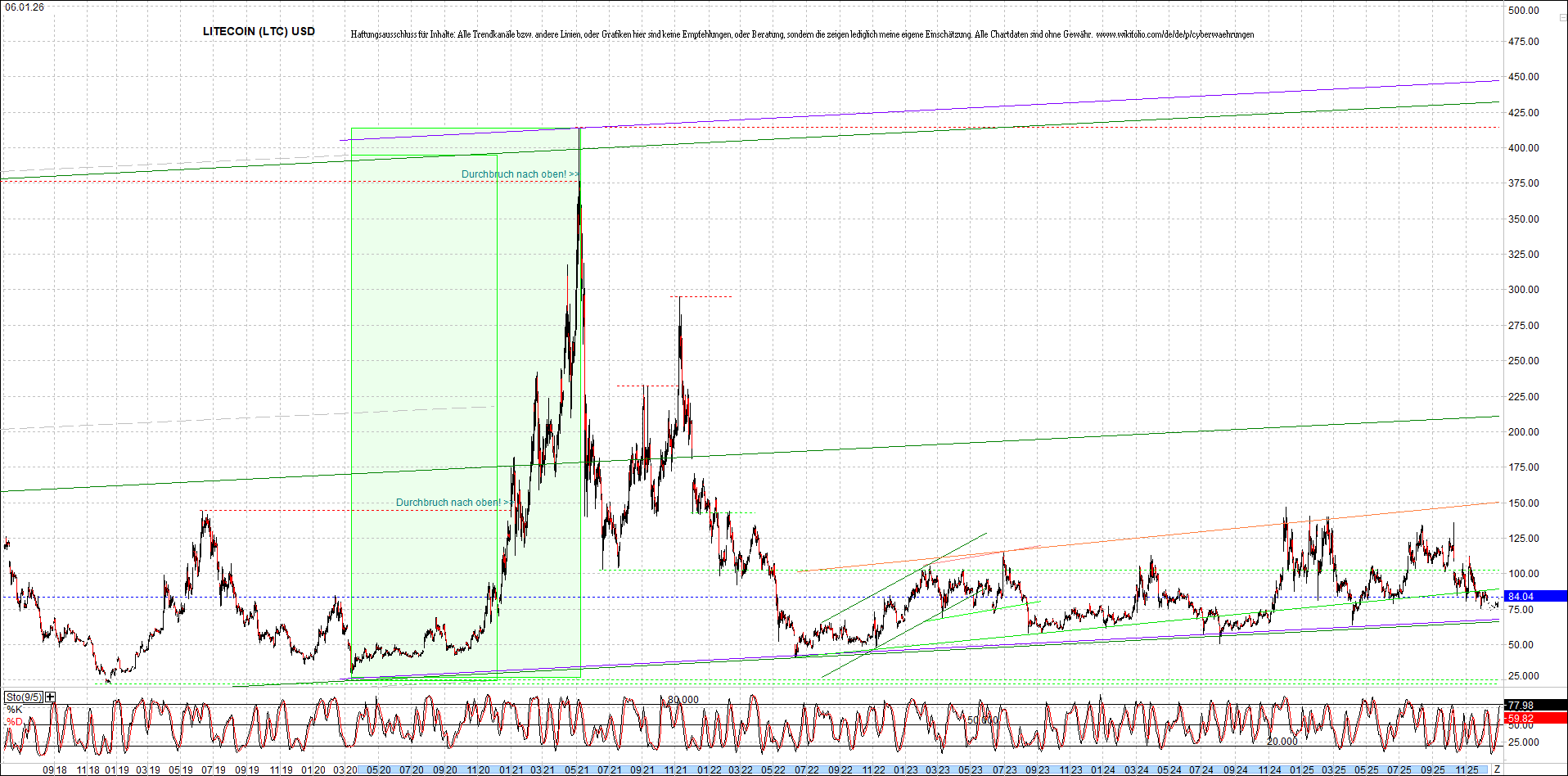 LITECOIN (LTC) – 6 Jahre Chart, von heute Morgen, mit Charttechnik.