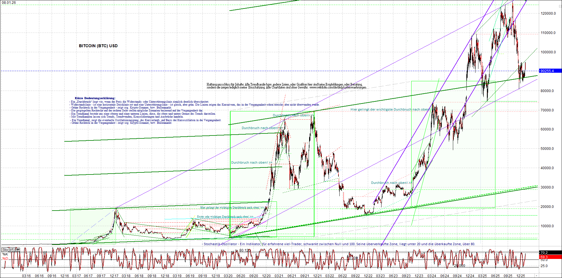 BITCOIN (BTC) – 10 Jahre Chart, von heute Morgen, mit Charttechnik.