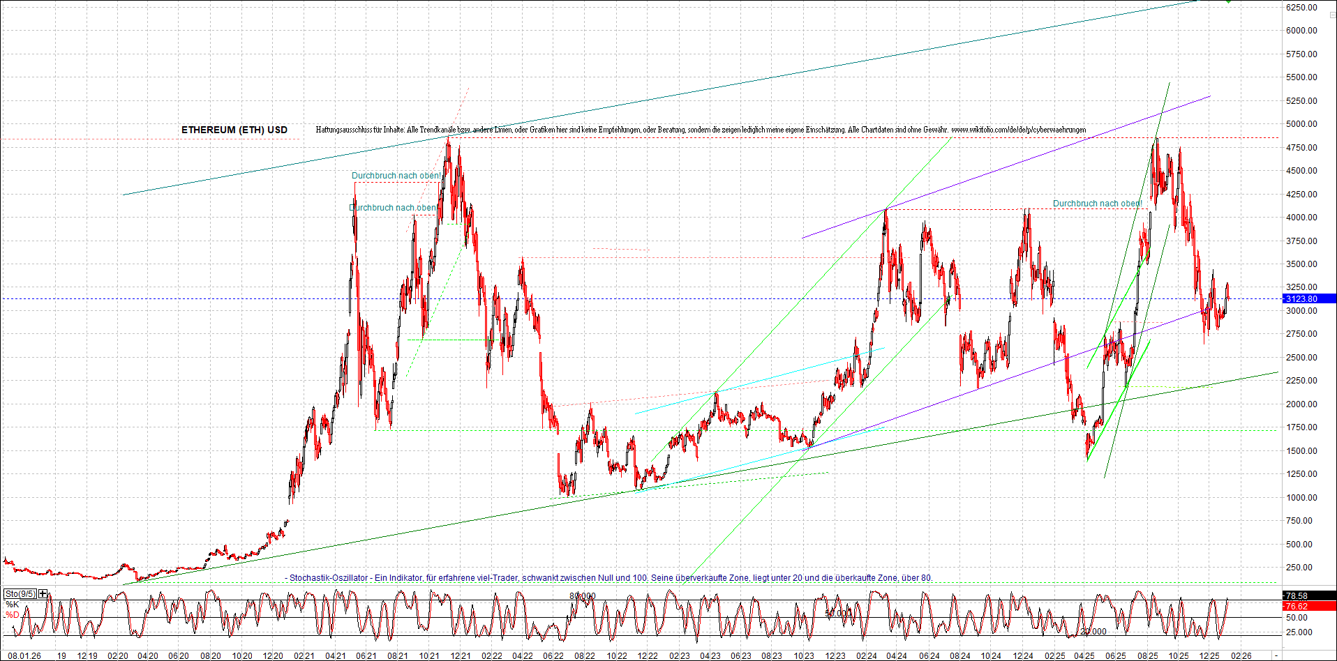 ETHEREUM (ETH) – 5 Jahre Chart, von heute Morgen, mit Charttechnik.