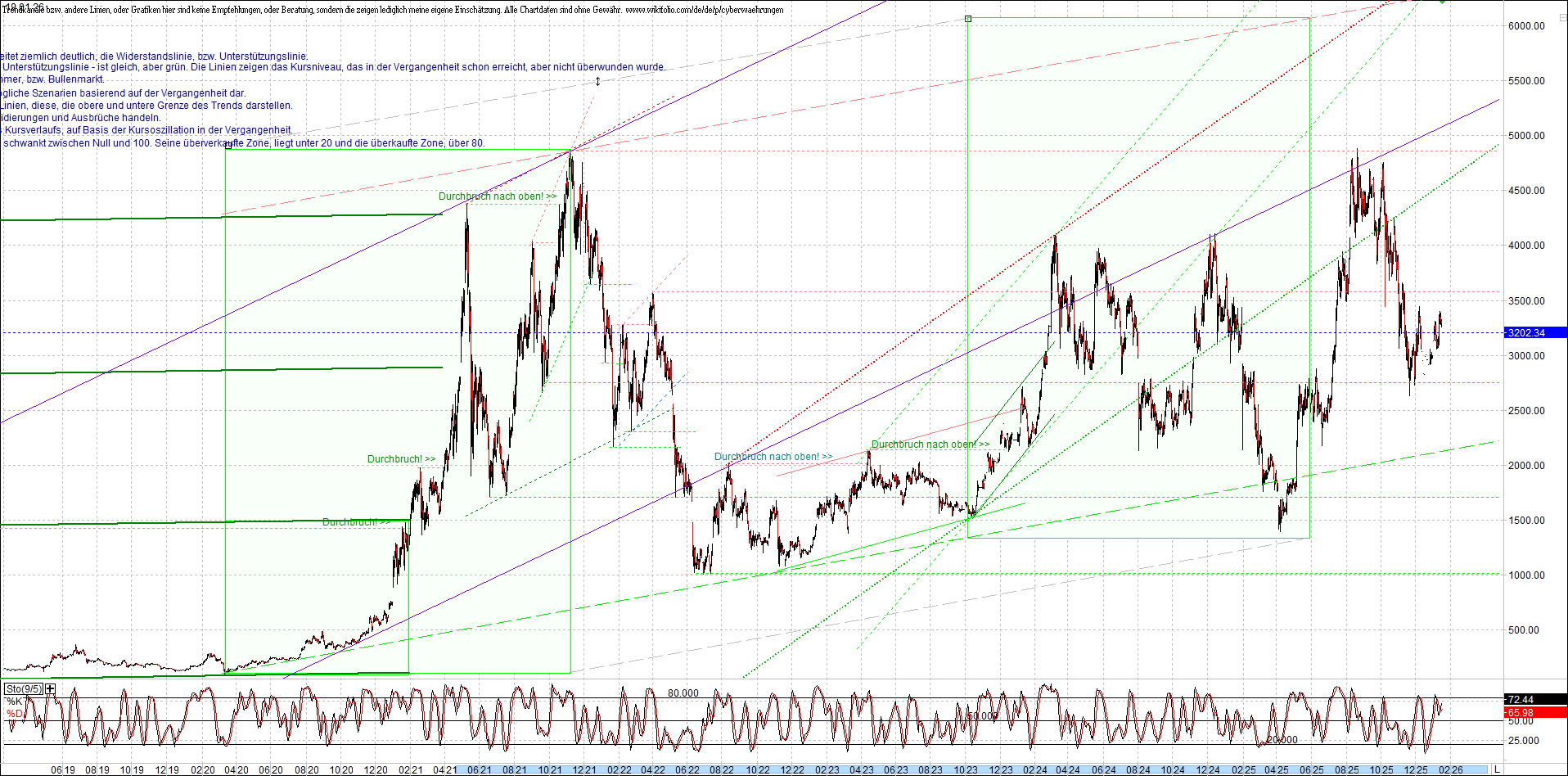 ETHEREUM (ETH) – 5 Jahre Chart, von heute Morgen, mit Charttechnik.
