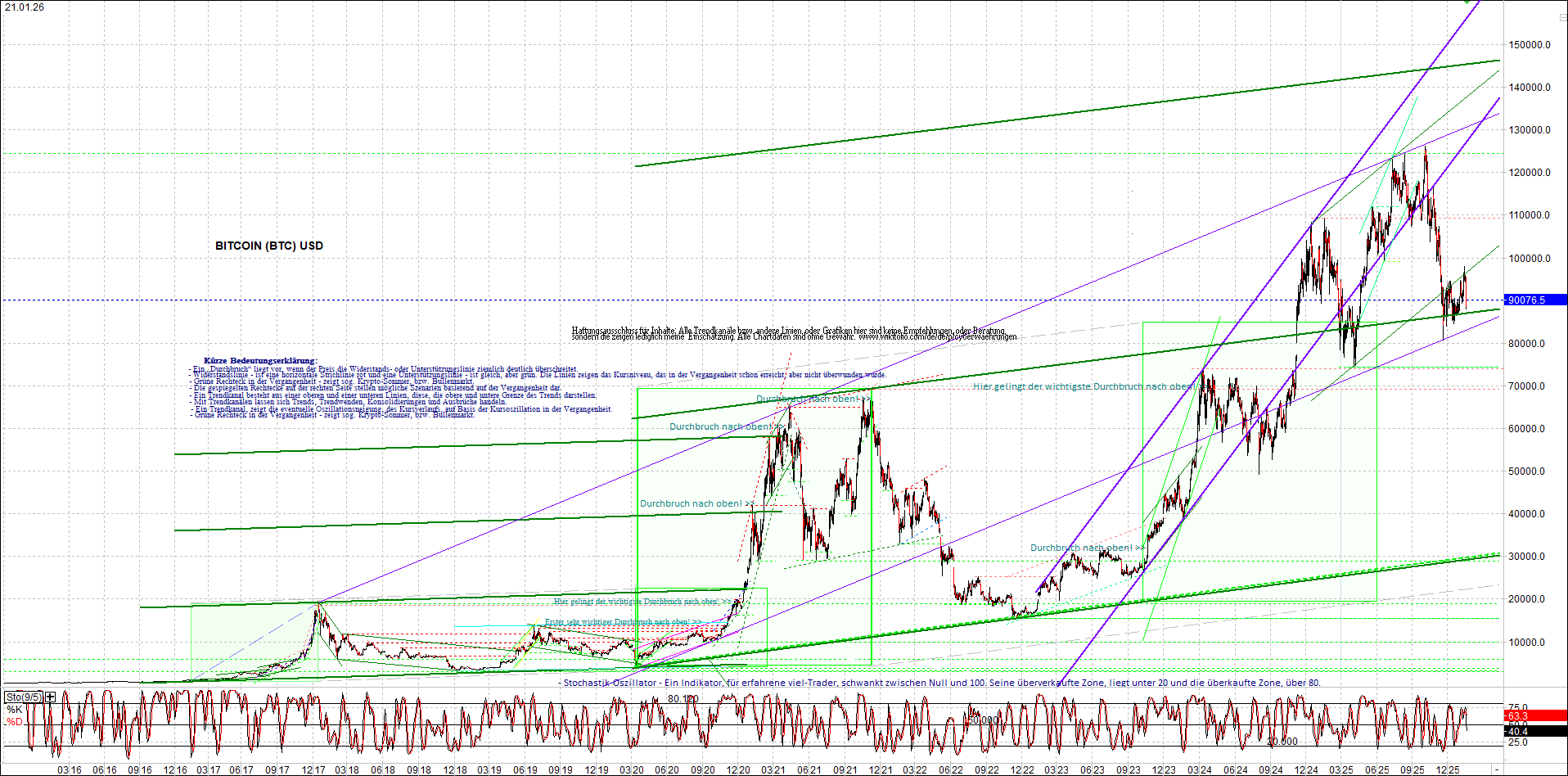 BITCOIN (BTC) – 10 Jahre Chart, von heute Morgen, mit Charttechnik.