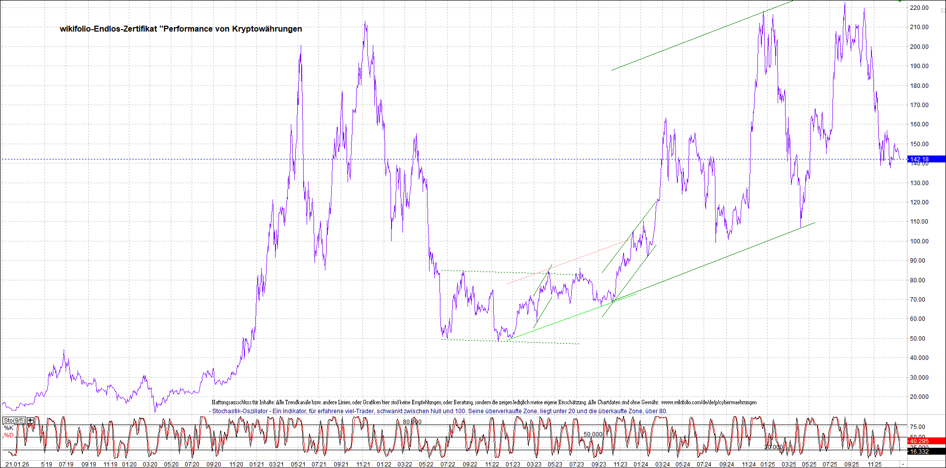 Das Zertifikat, bekannt als: Endlos-Zertifikat bezogen auf LUS Wikifolio-Index „Performance von Kryptowährungen“.