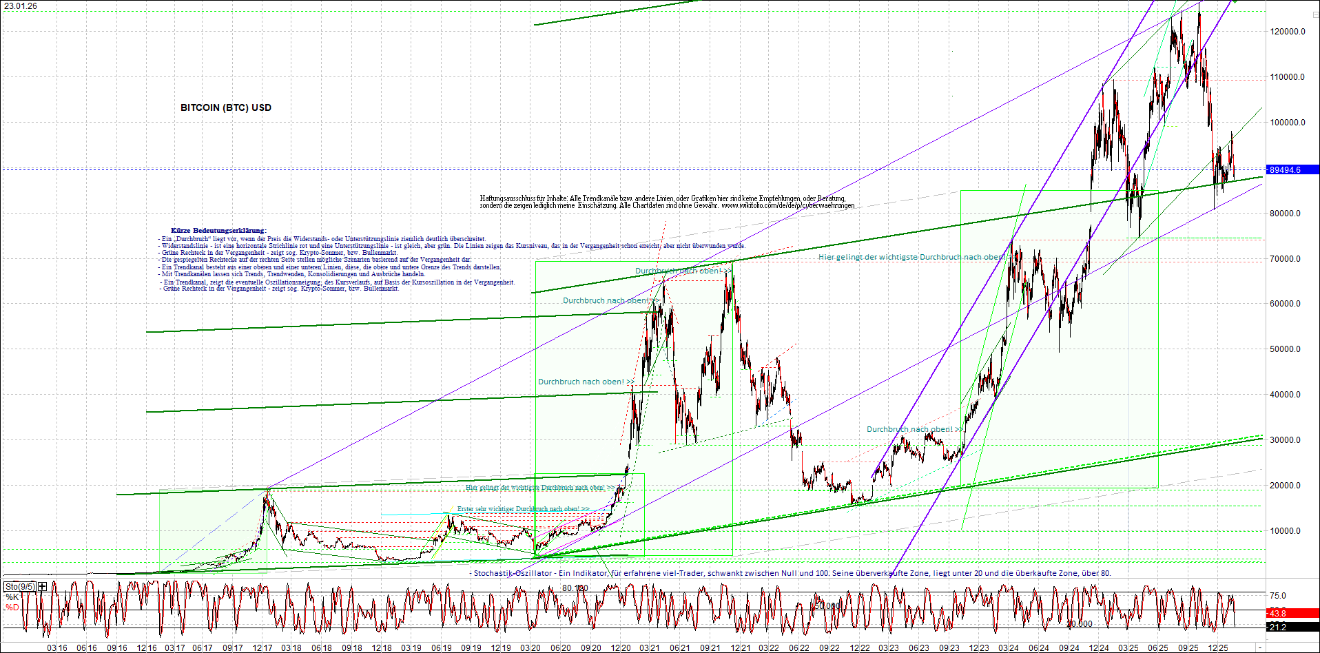 BITCOIN (BTC) – 10 Jahre Chart, von heute Morgen, mit Charttechnik.