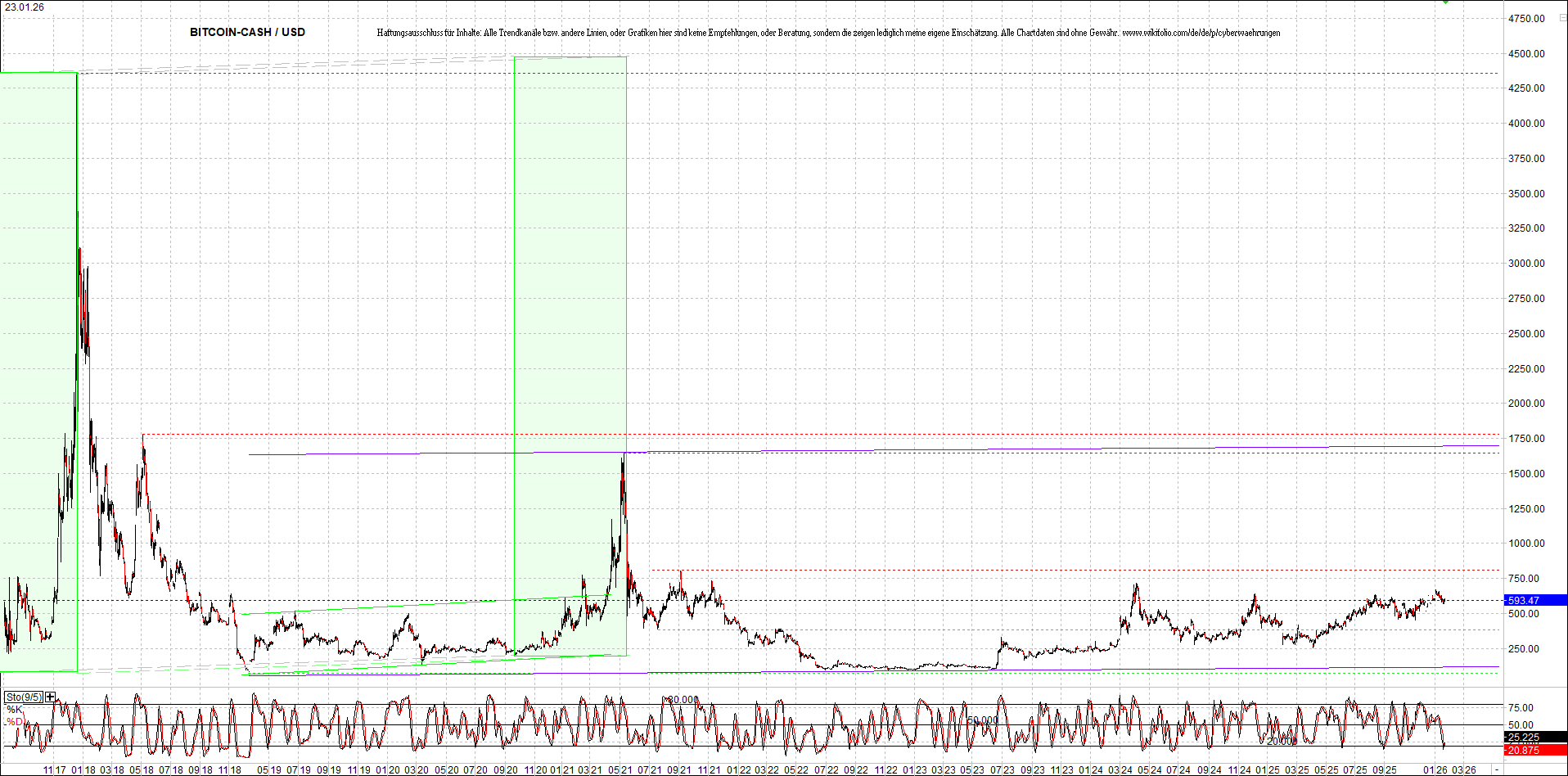 Bitcoin Cash (BCH) – 6 Jahre Chart, von heute Morgen, mit Charttechnik.
