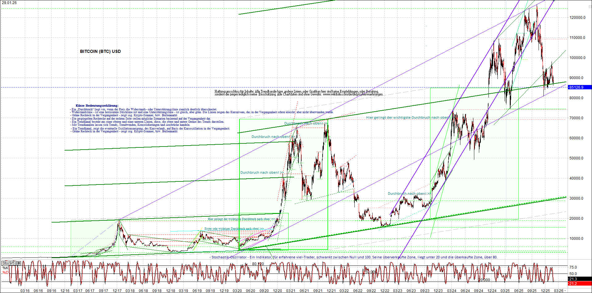 BITCOIN (BTC) – 11 Jahre Chart, von heute Morgen, mit Charttechnik.