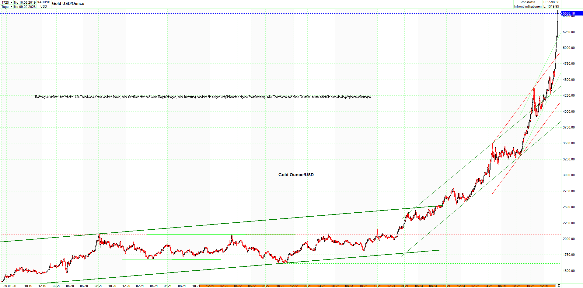 GOLD – 10 Jahre Chart von heute Morgen, mit Charttechnik.