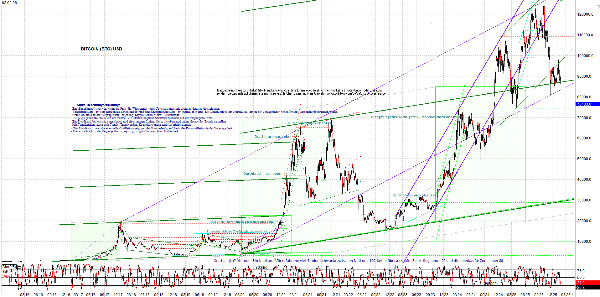 BITCOIN (BTC) – 10 Jahre Chart, von heute Morgen, mit Charttechnik.