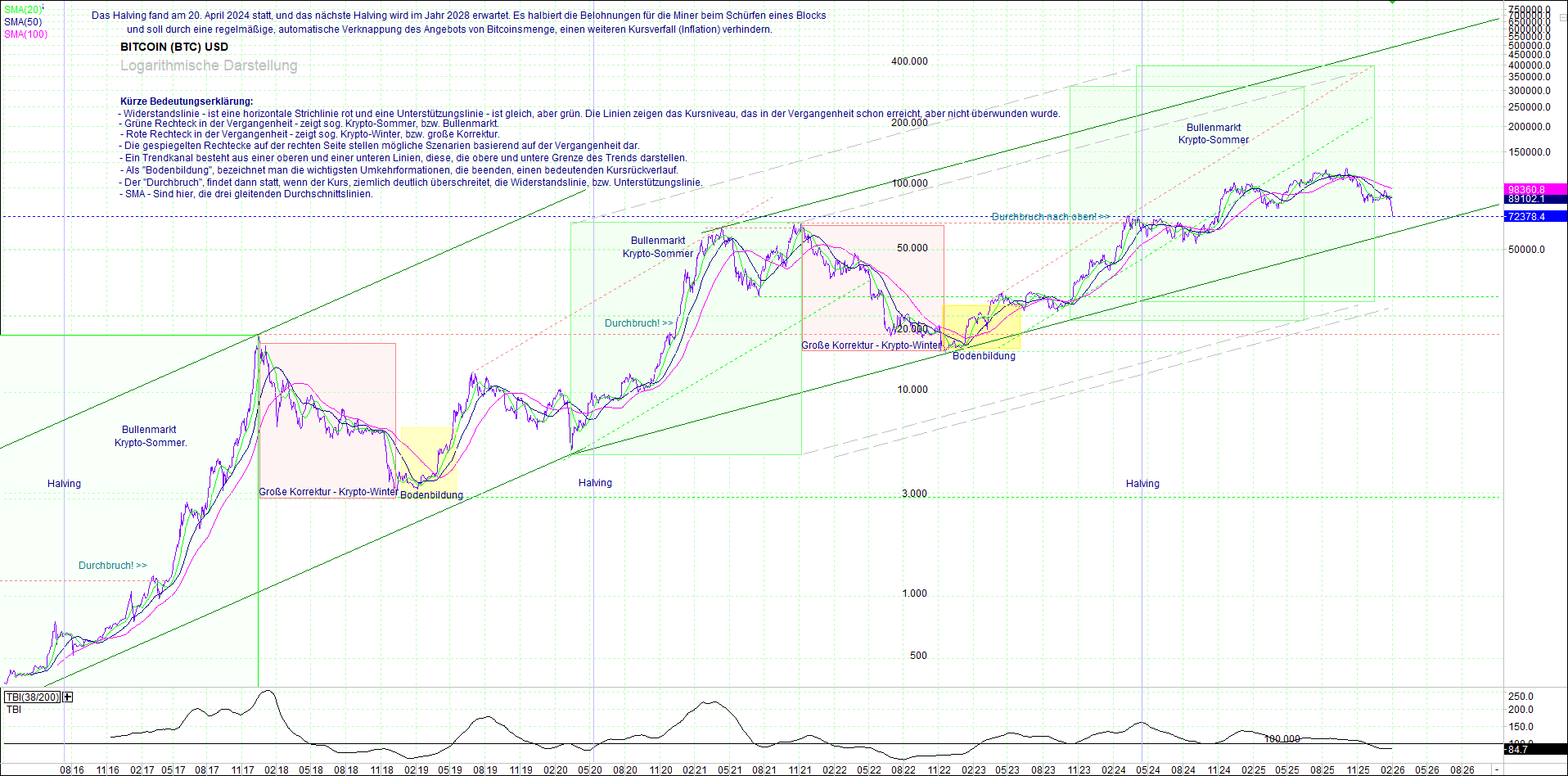 BITCOIN (BTC) – 10 Jahre Chart, von heute Morgen, mit Charttechnik.