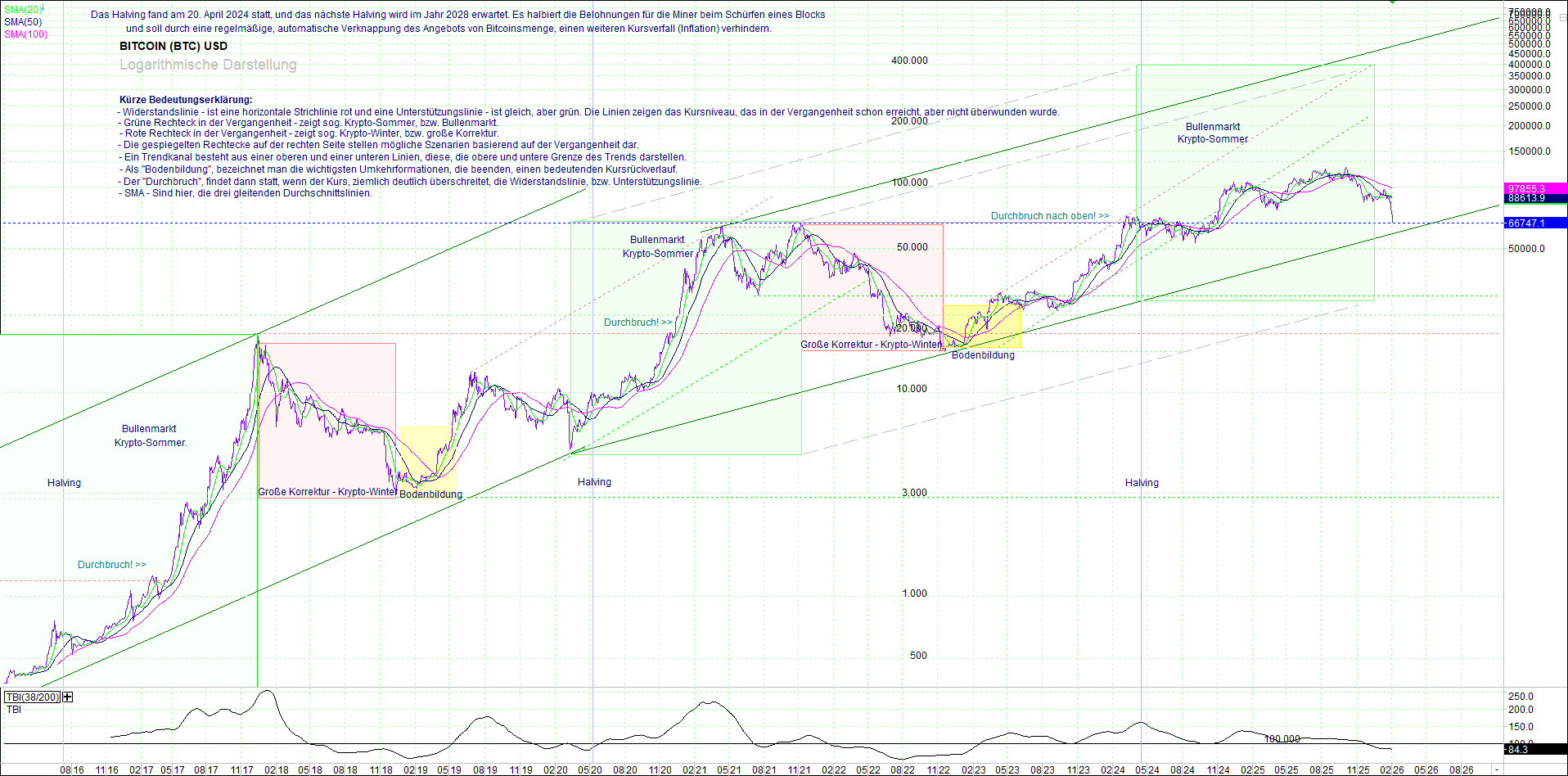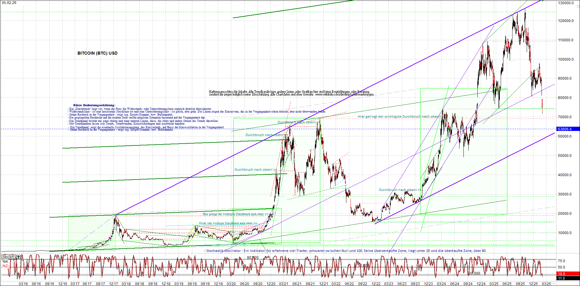 BITCOIN (BTC) – 10 Jahre Chart, von heute Morgen, mit Charttechnik.