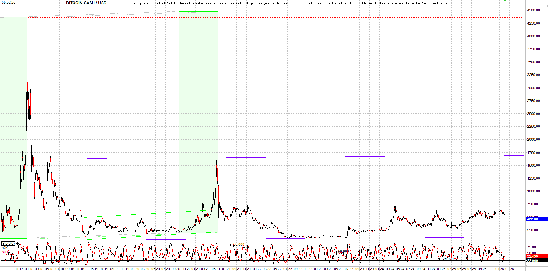 Bitcoin Cash (BCH) – 6 Jahre Chart, von heute Morgen, mit Charttechnik.