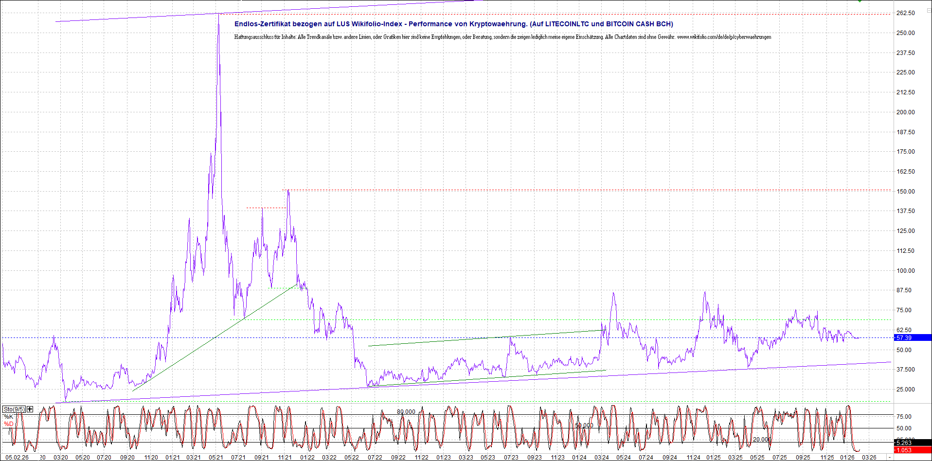 Anbei das Zertifikat, bekannt als: Endlos-Zertifikat bezogen auf LUS Wikifolio-Index „Performance von Kryptowaehrung“, jetzt versorgt mit Performance von Litecoin (LTC) und mit Bitcoin Cash (BCH).