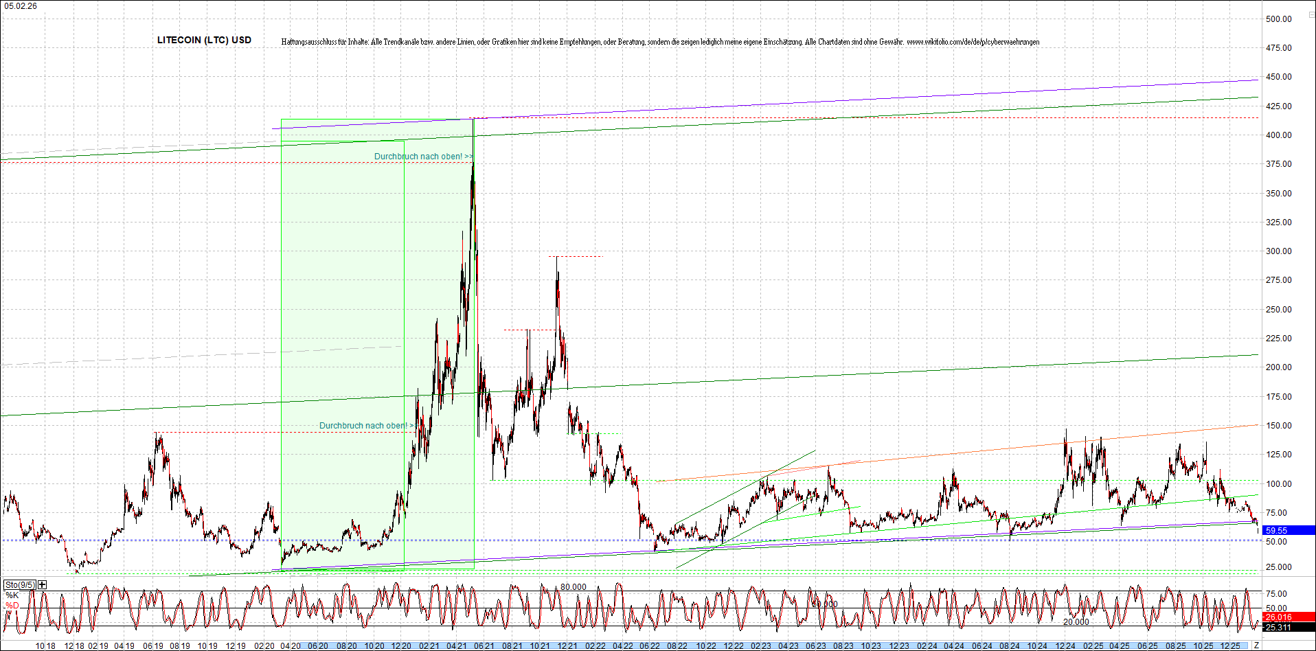 LITECOIN (LTC) – 6 Jahre Chart, von heute Morgen, mit Charttechnik.