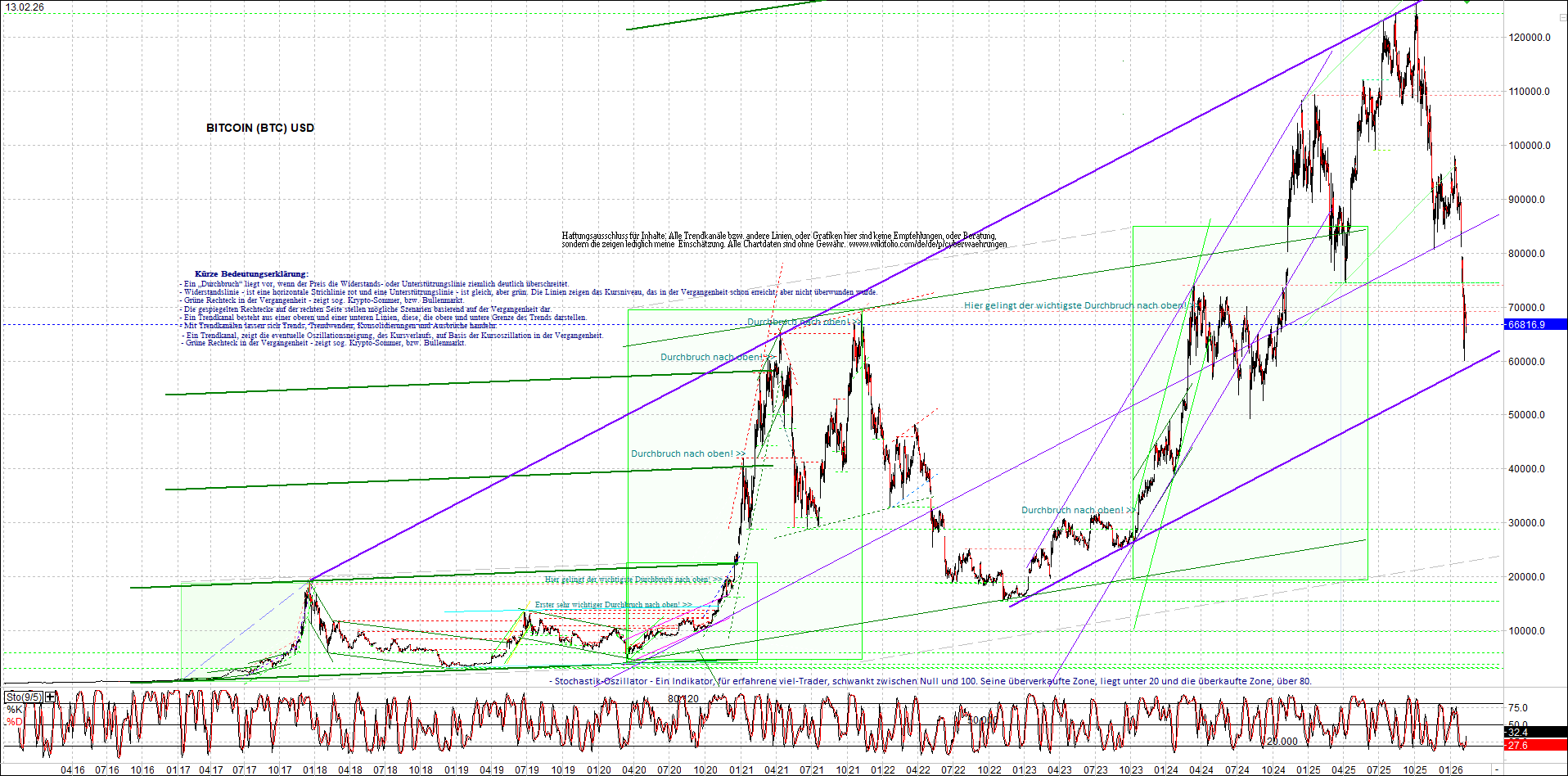 BITCOIN (BTC) – 10 Jahre Chart, von heute Morgen, mit Charttechnik.