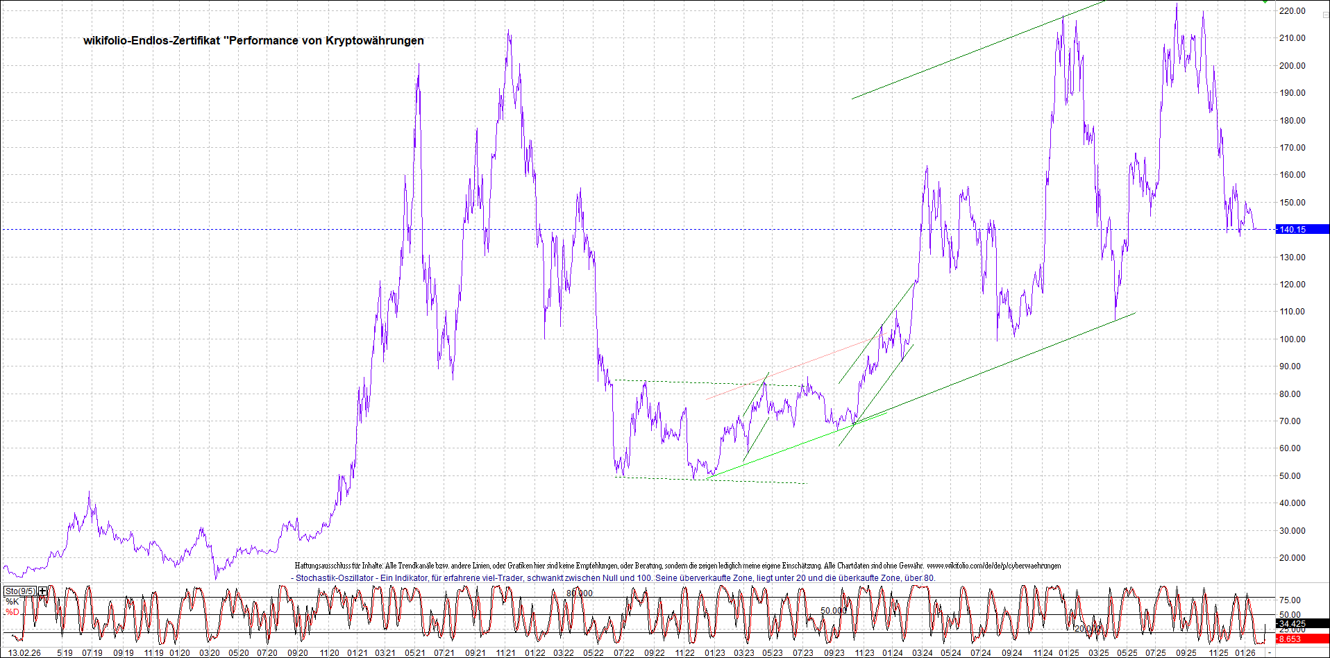 Das Zertifikat, bekannt als: Endlos-Zertifikat bezogen auf LUS Wikifolio-Index „Performance von Kryptowährungen“.