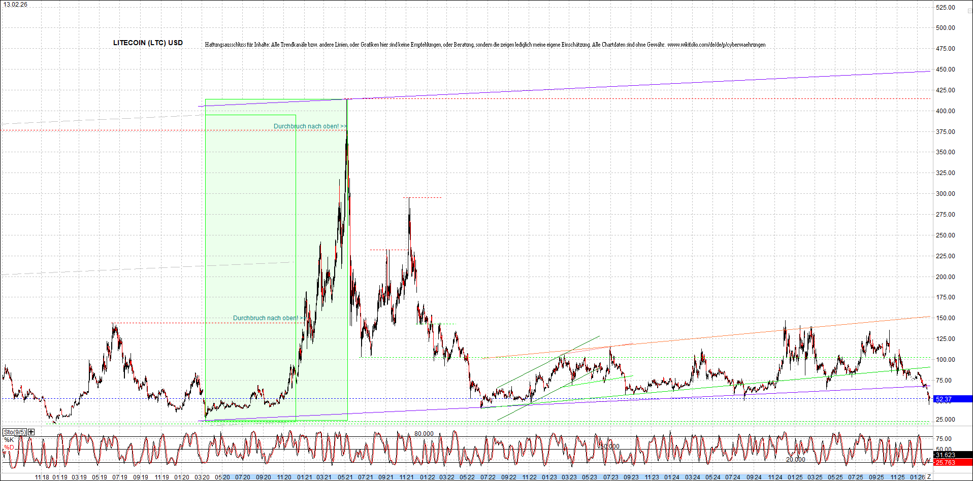 LITECOIN (LTC) – 6 Jahre Chart, von heute Morgen, mit Charttechnik.