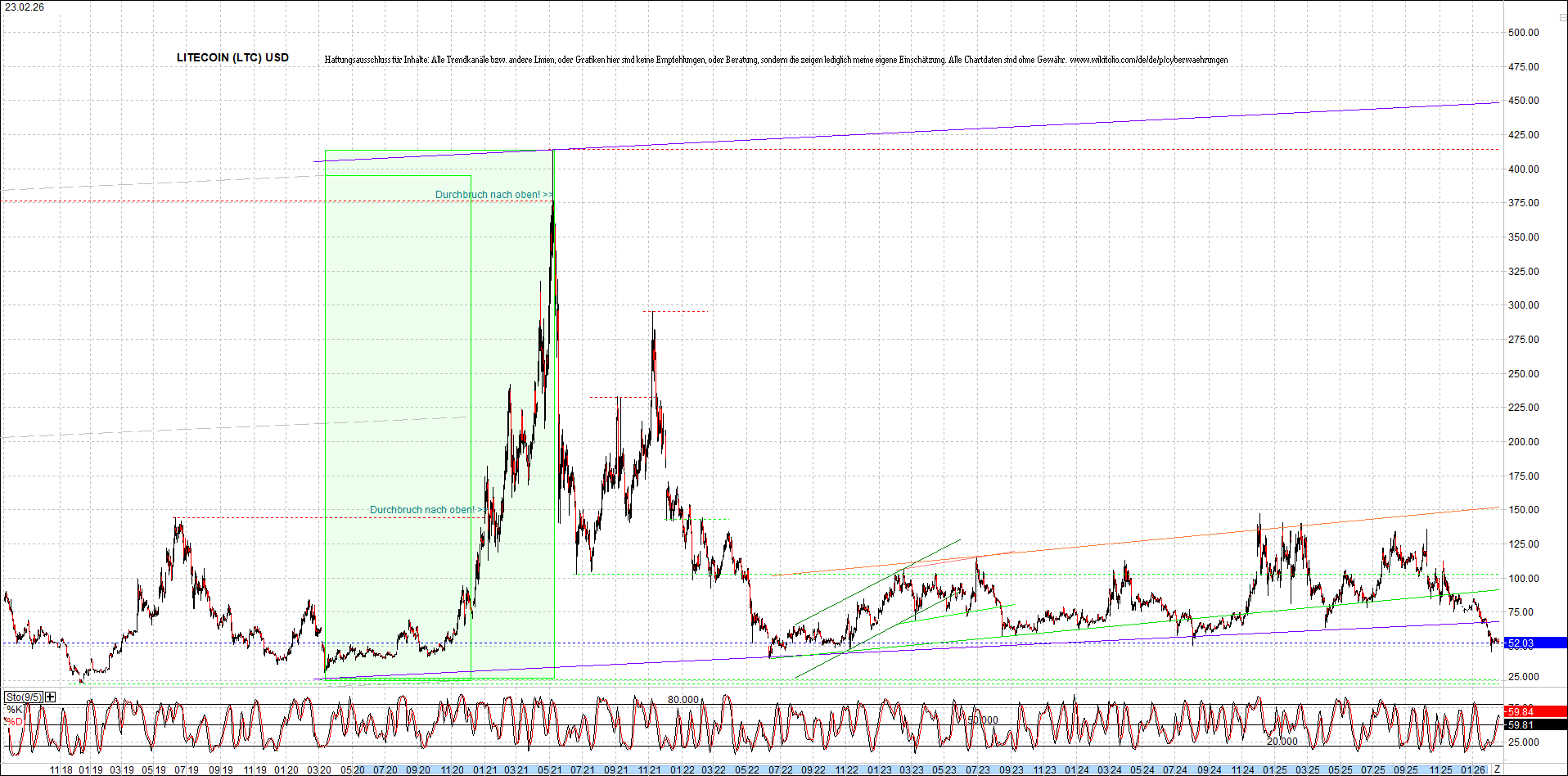 LITECOIN (LTC) – 6 Jahre Chart, von heute Morgen, mit Charttechnik.
