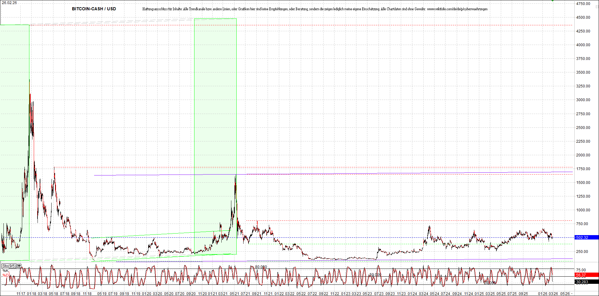 Bitcoin Cash (BCH) – 6 Jahre Chart, von heute Morgen, mit Charttechnik.