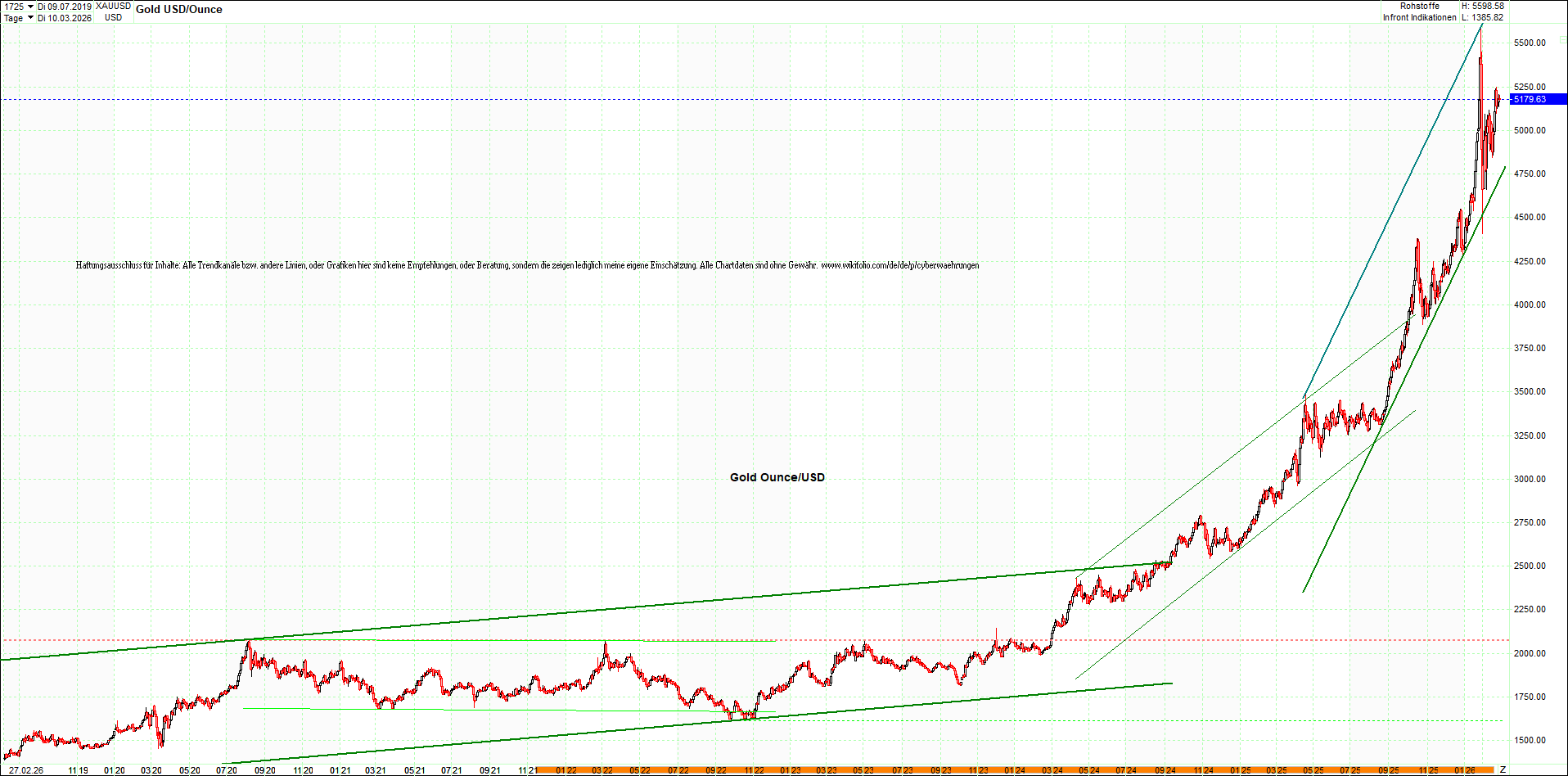 GOLD – 10 Jahre Chart von heute Morgen, mit Charttechnik.