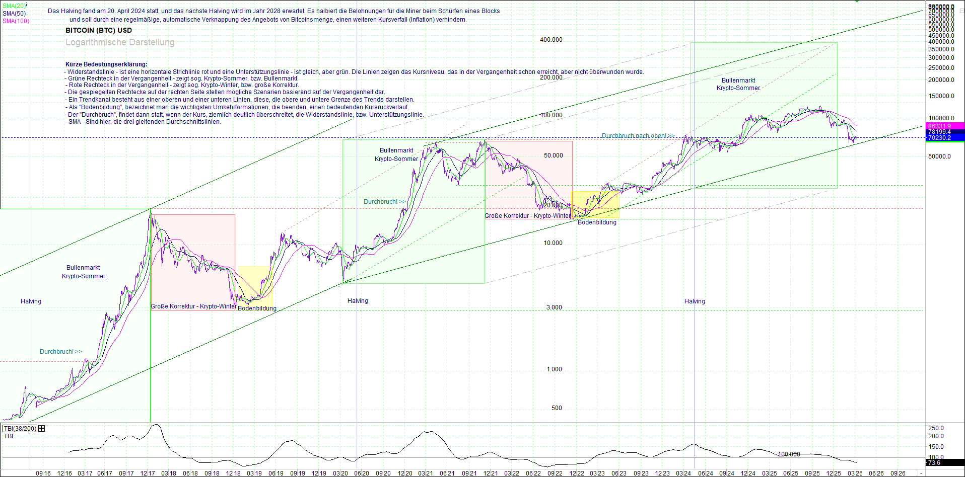 BITCOIN (BTC) – 10 Jahre Chart, von heute Morgen, mit Charttechnik.