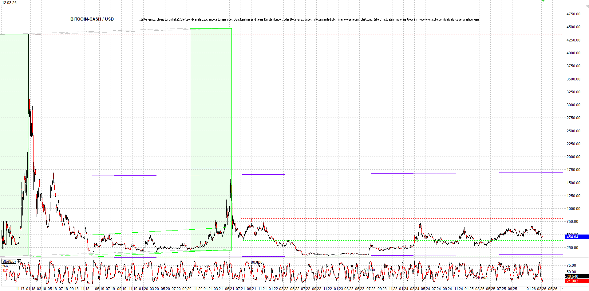 Bitcoin Cash (BCH) – 6 Jahre Chart, von heute Morgen, mit Charttechnik.