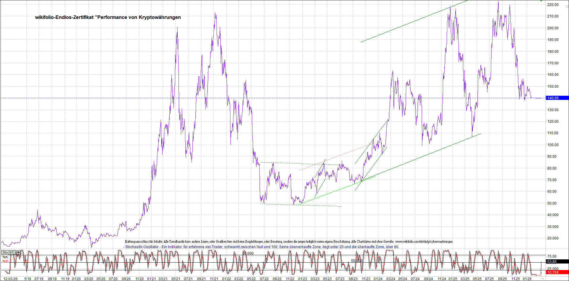 Das Zertifikat, bekannt als: Endlos-Zertifikat bezogen auf LUS Wikifolio-Index „Performance von Kryptowährungen“.