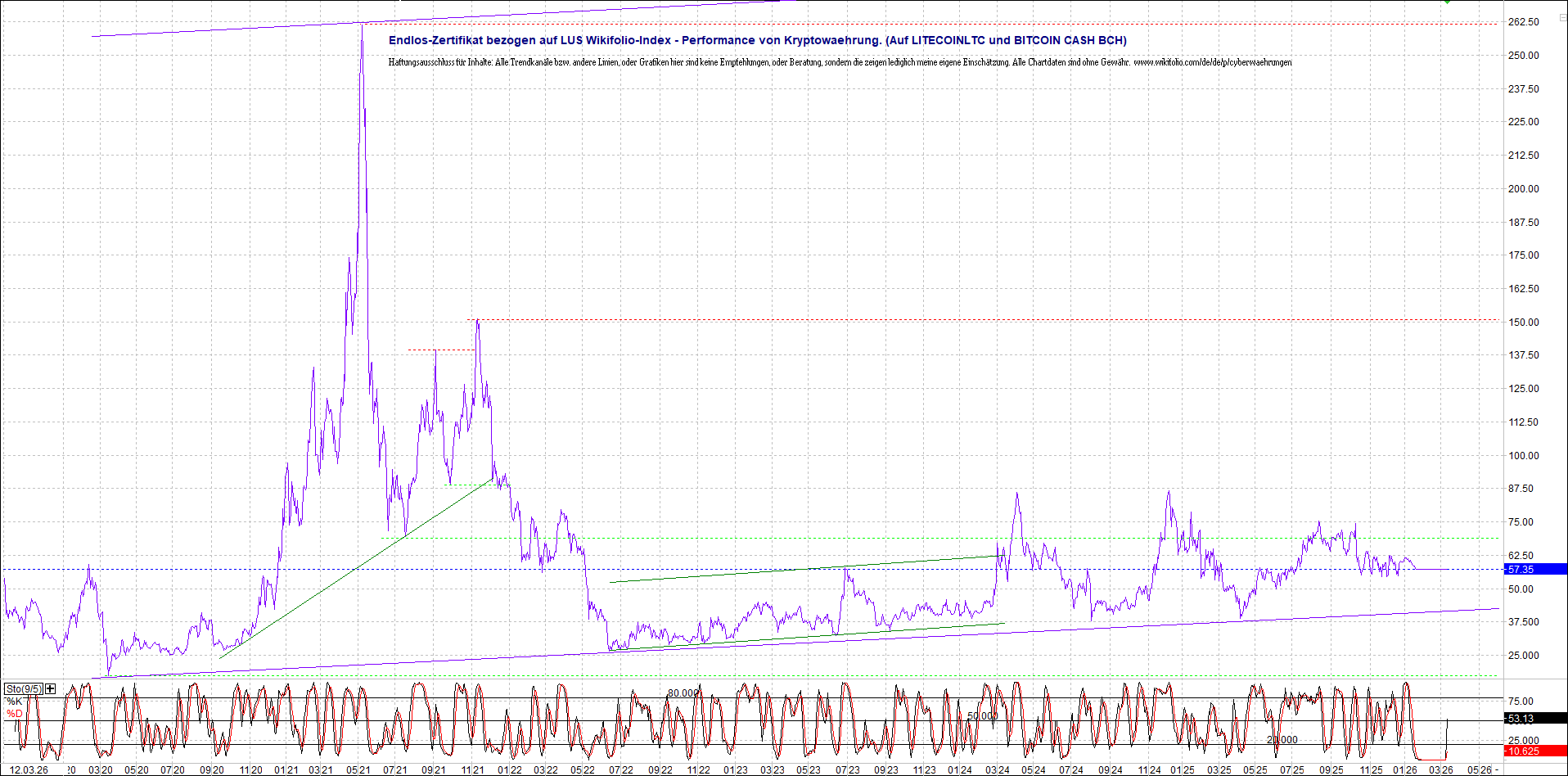 Anbei das Zertifikat, bekannt als: Endlos-Zertifikat bezogen auf LUS Wikifolio-Index „Performance von Kryptowaehrung“, jetzt versorgt mit Performance von Litecoin (LTC) und mit Bitcoin Cash (BCH).