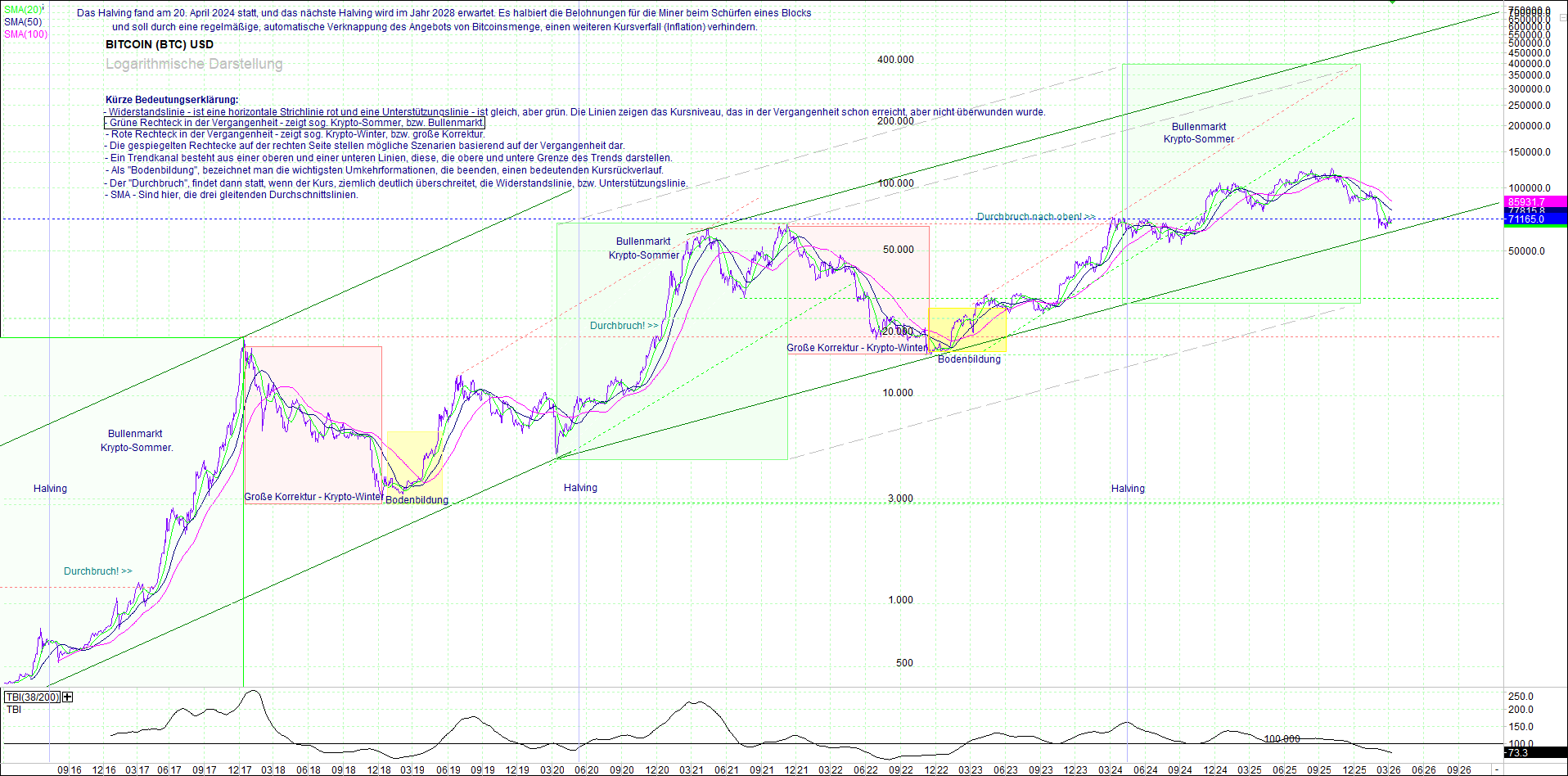 BITCOIN (BTC) – 10 Jahre Chart, von heute Morgen, mit Charttechnik.