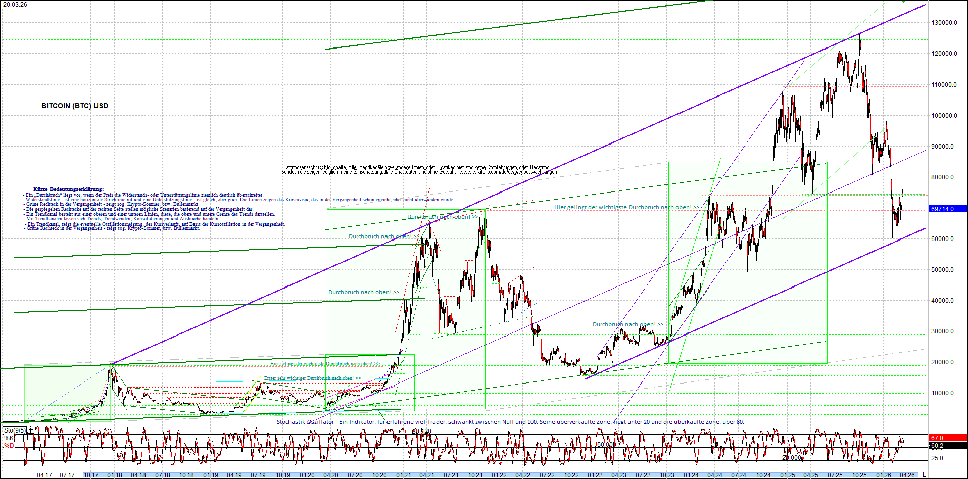 BITCOIN (BTC) – 10 Jahre Chart, von heute Morgen, mit Charttechnik.