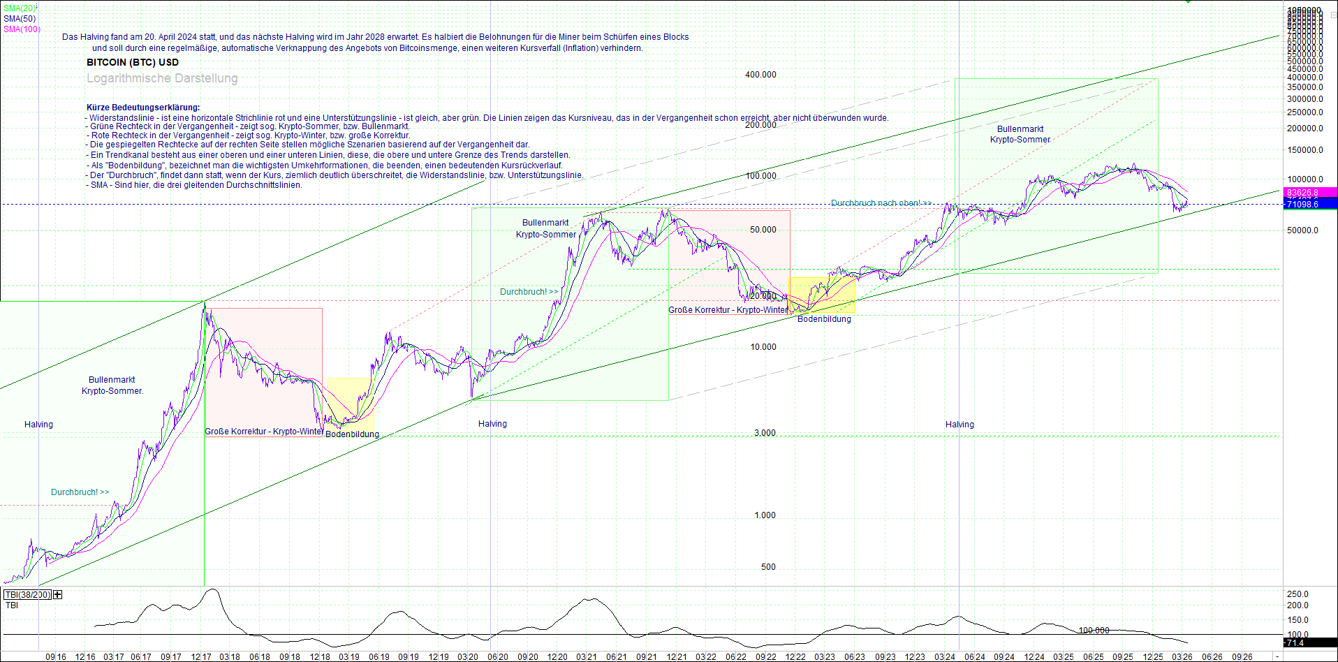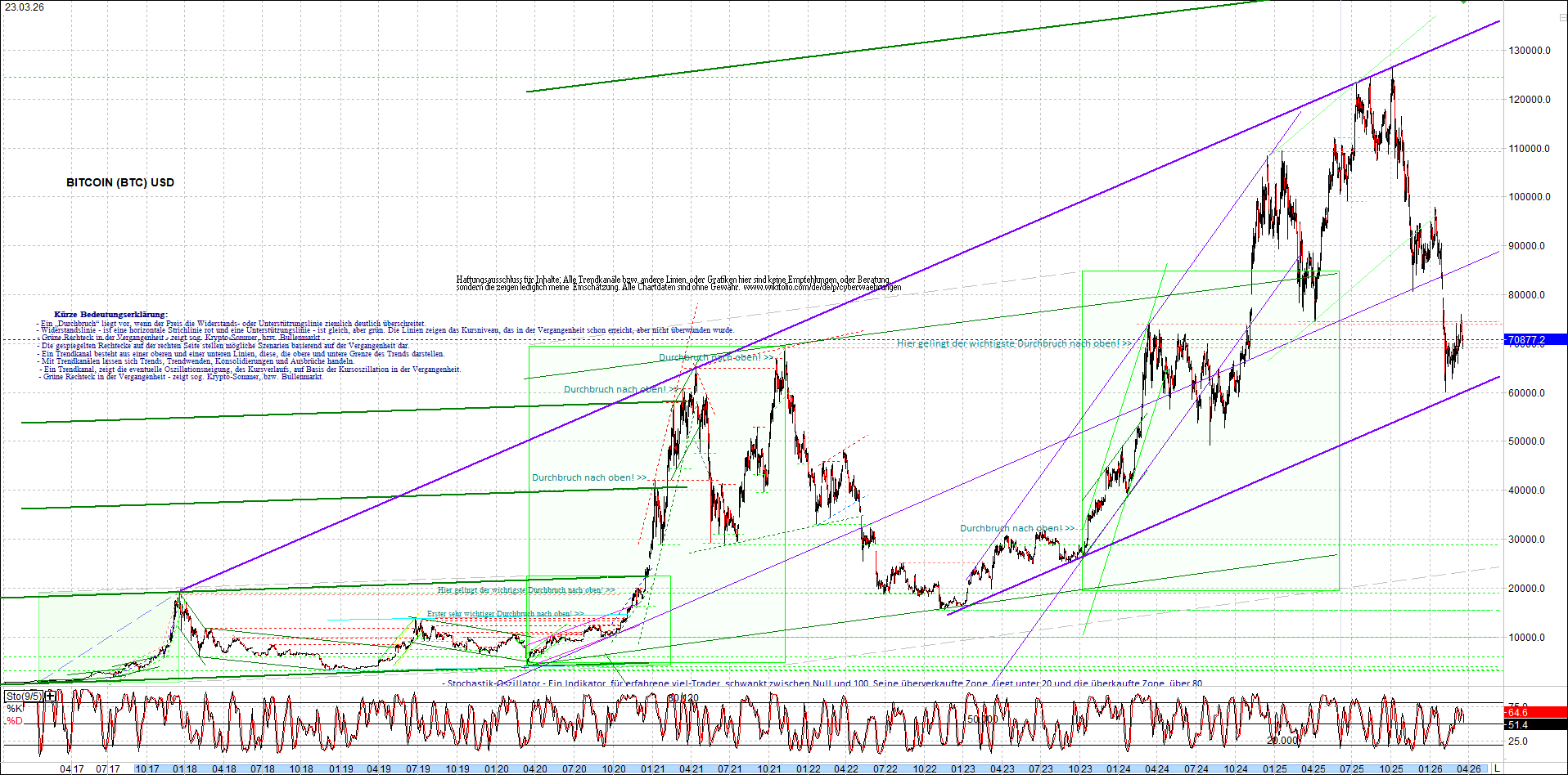BITCOIN (BTC) – 10 Jahre Chart, von heute Morgen, mit Charttechnik.