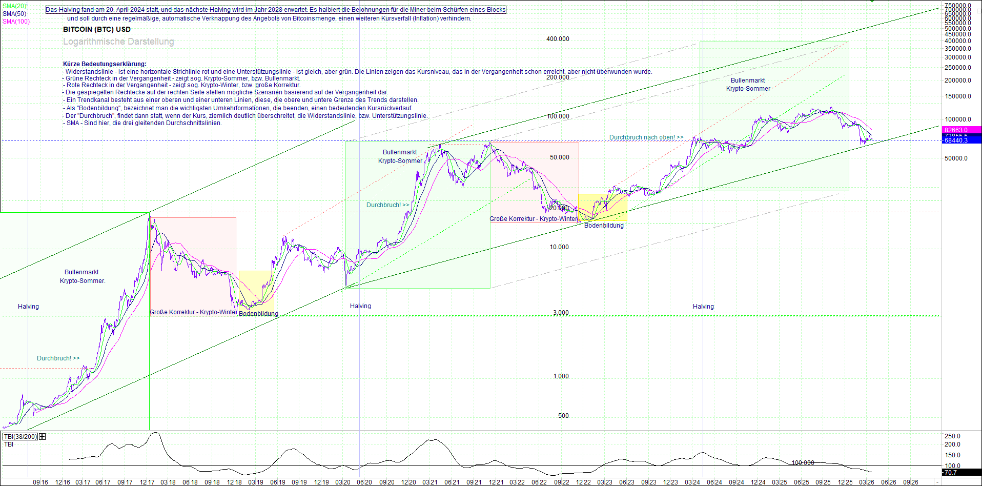 BITCOIN (BTC) – 10 Jahre Chart, von heute Morgen, mit Charttechnik.