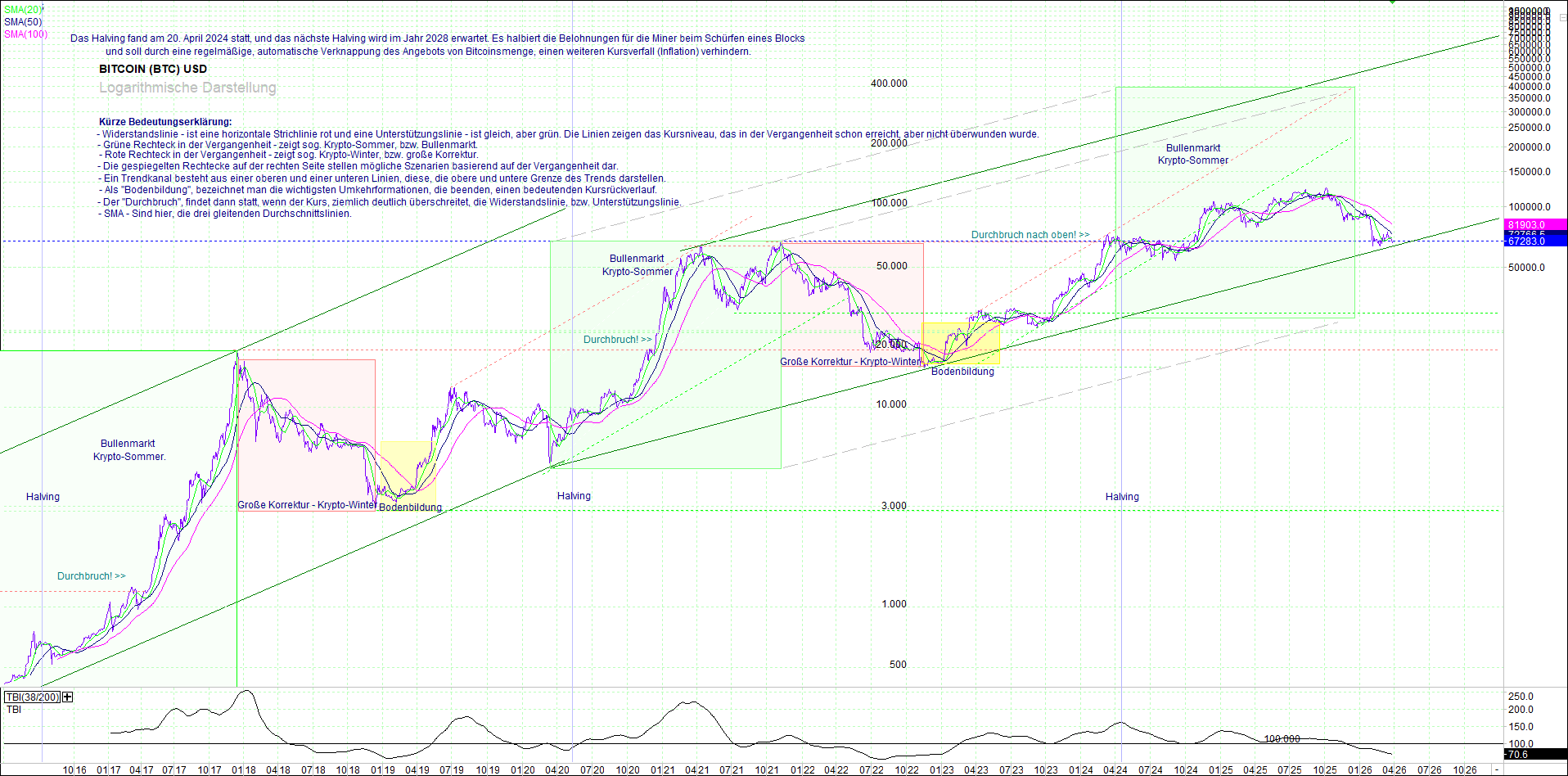 BITCOIN (BTC) – 10 Jahre Chart, von heute Morgen, mit Charttechnik.