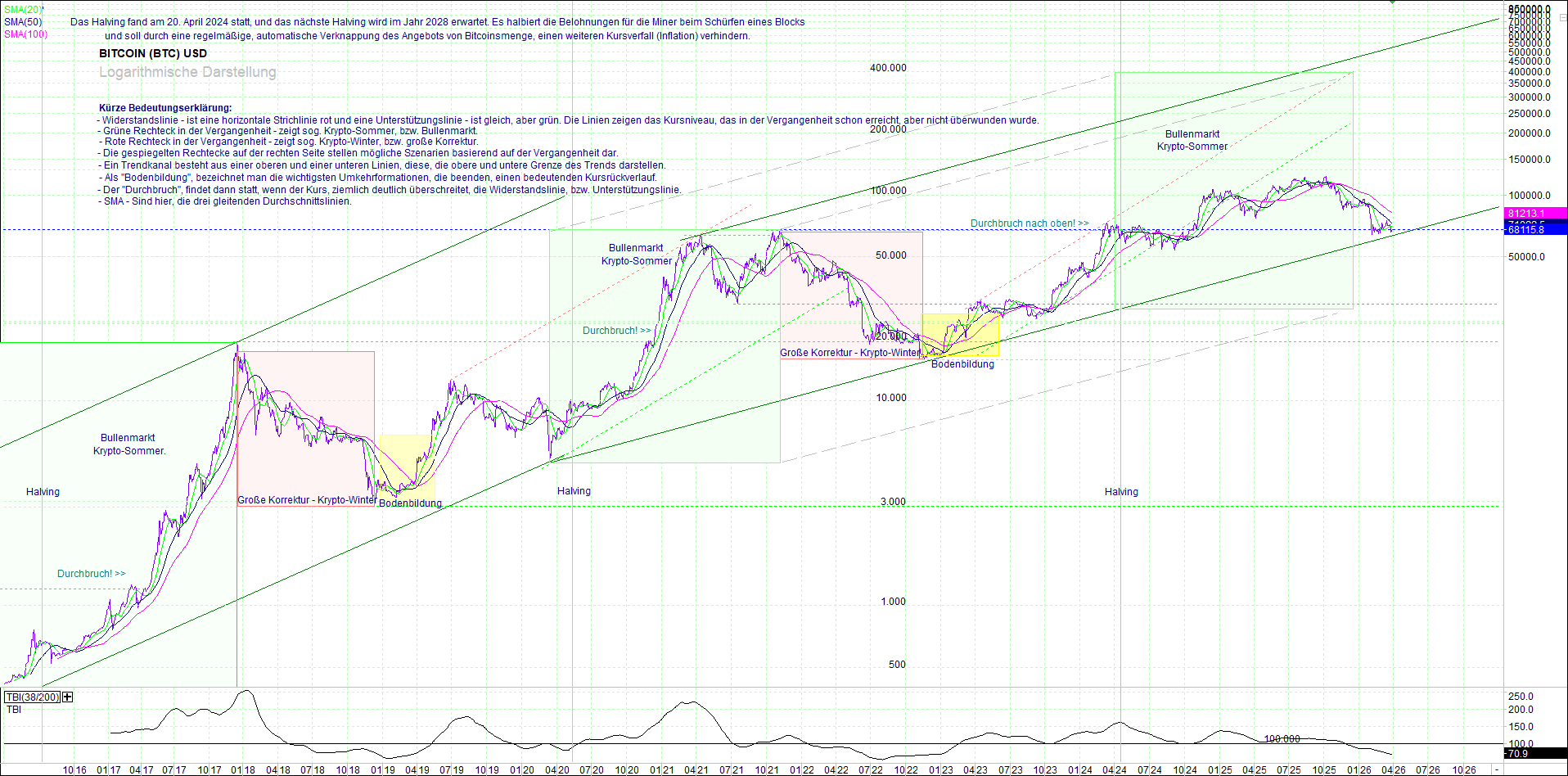 BITCOIN (BTC) – 10 Jahre Chart, von heute Morgen, mit Charttechnik.